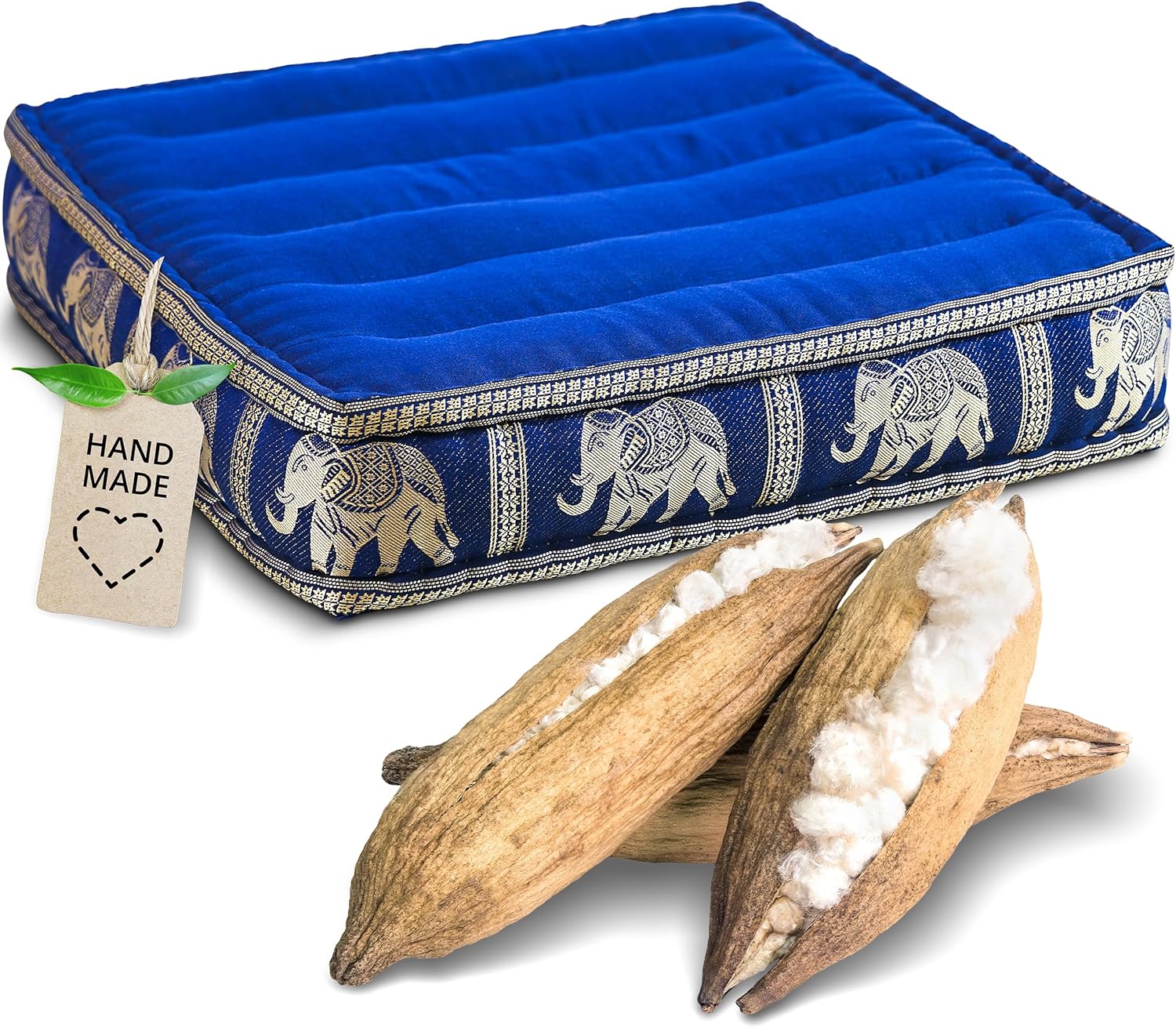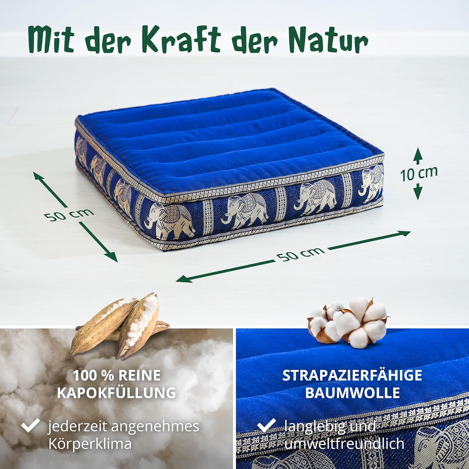 - PRAKTISCH UND VIELSEITIG: Das formfeste Kissen bleibt auch bei langem Sitzen stabil. Kombiniert mit einer Rollmatte oder einem Dreieckskissen aus Kapok, der Pflanzen-Daune, bringst du thailändische Gemütlichkeit in dein Leben. Masse Bodensitzkissen: 50