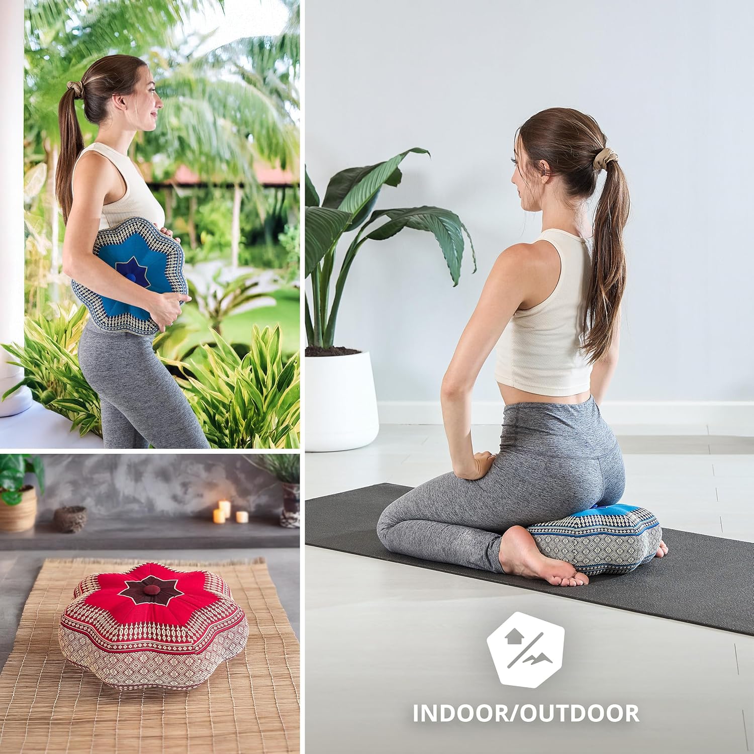 - PRAKTISCH UND VIELSEITIG: Das formfeste Kissen bleibt auch bei langem Sitzen stabil. Der Knopf in der Mitte sorgt ebenfalls für hohen Sitzkomfort und eine gemütliche Sitzfläche. Kombiniert mit einer Klappmatratze oder Rollmatte aus Kapok, der