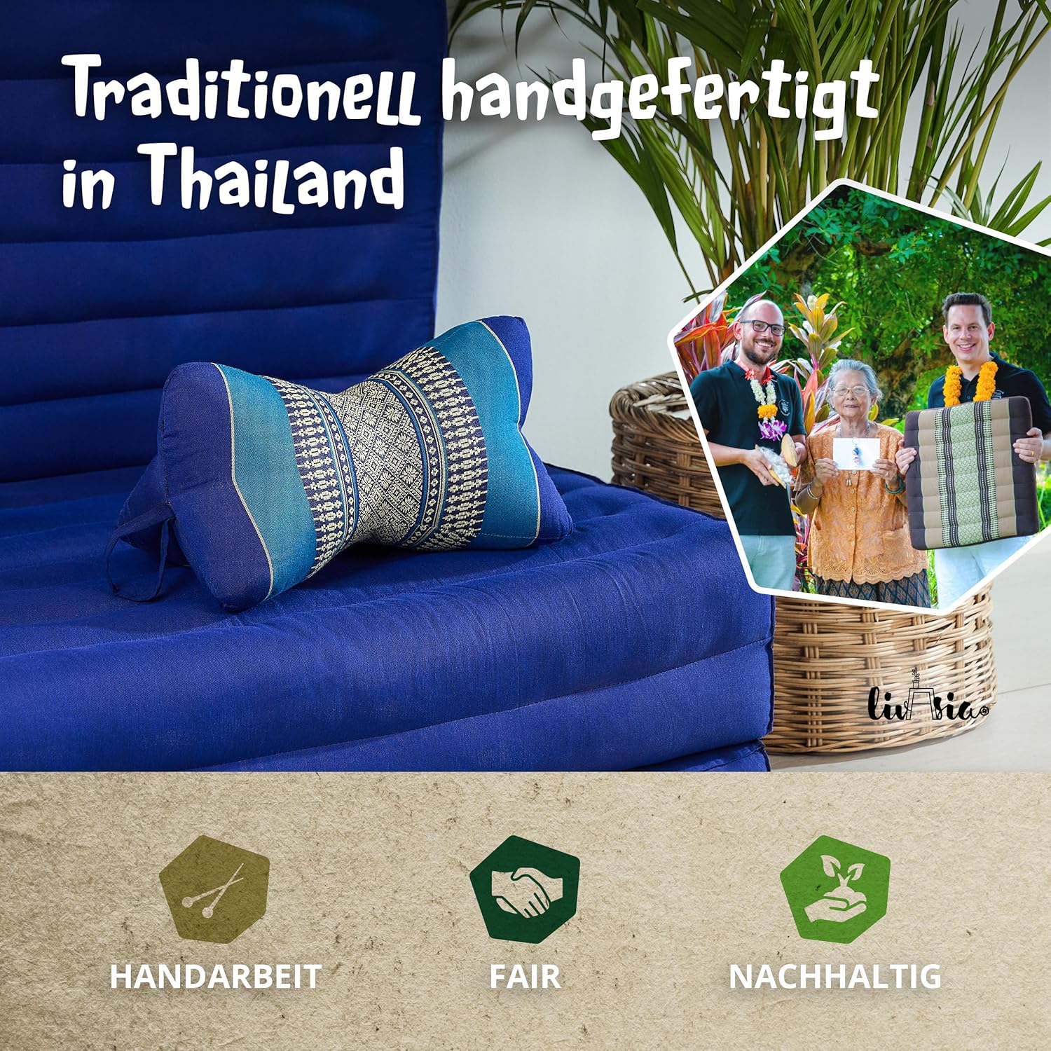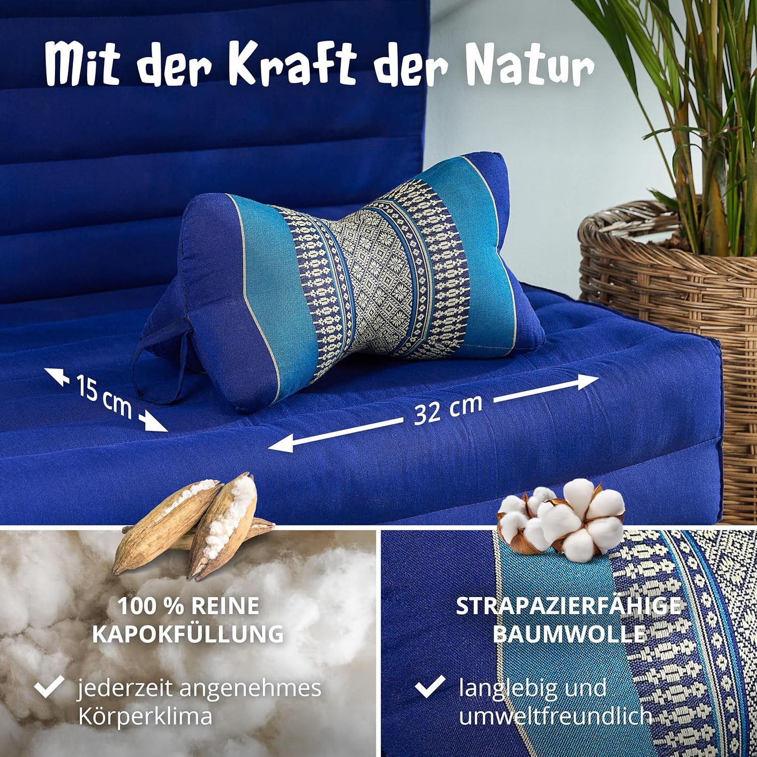 - PRAKTISCH UND VIELSEITIG: Das feste und stabile Kissen ist ein zuverlässiger, langlebiger und robuster Begleiter für Reise und Alltag. Kombiniert mit einer Thaimatte oder einer Faltmatratze aus Kapok, der Pflanzen-Daune, bringst du thailändische