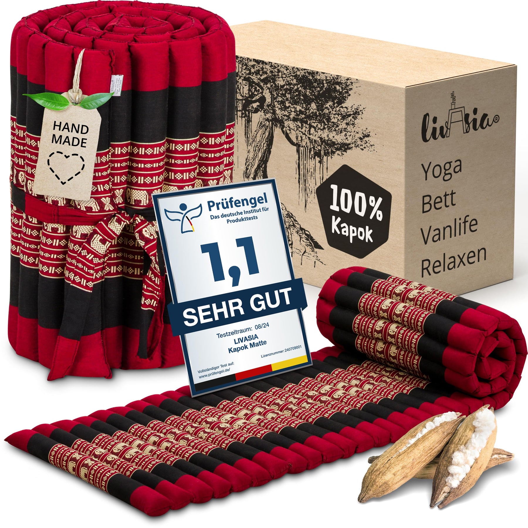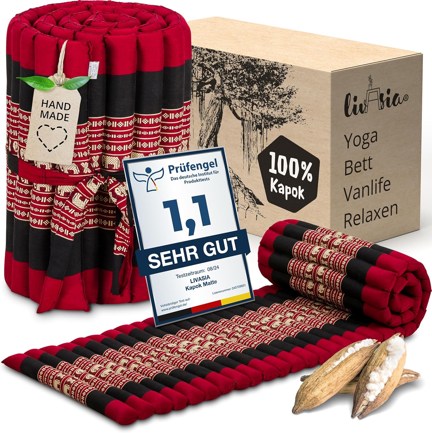 - NATÜRLICH UND NACHHALTIG: livasia Rollmatten sind mit reinem und unbehandeltem Kapok gefüllt. Die wildwachsende Pflanzendaune wird schonend von Hand geerntet und trägt zu einem gesunden Urwald bei. Der Bezug aus robuster Baumwolle macht die Thaimatte