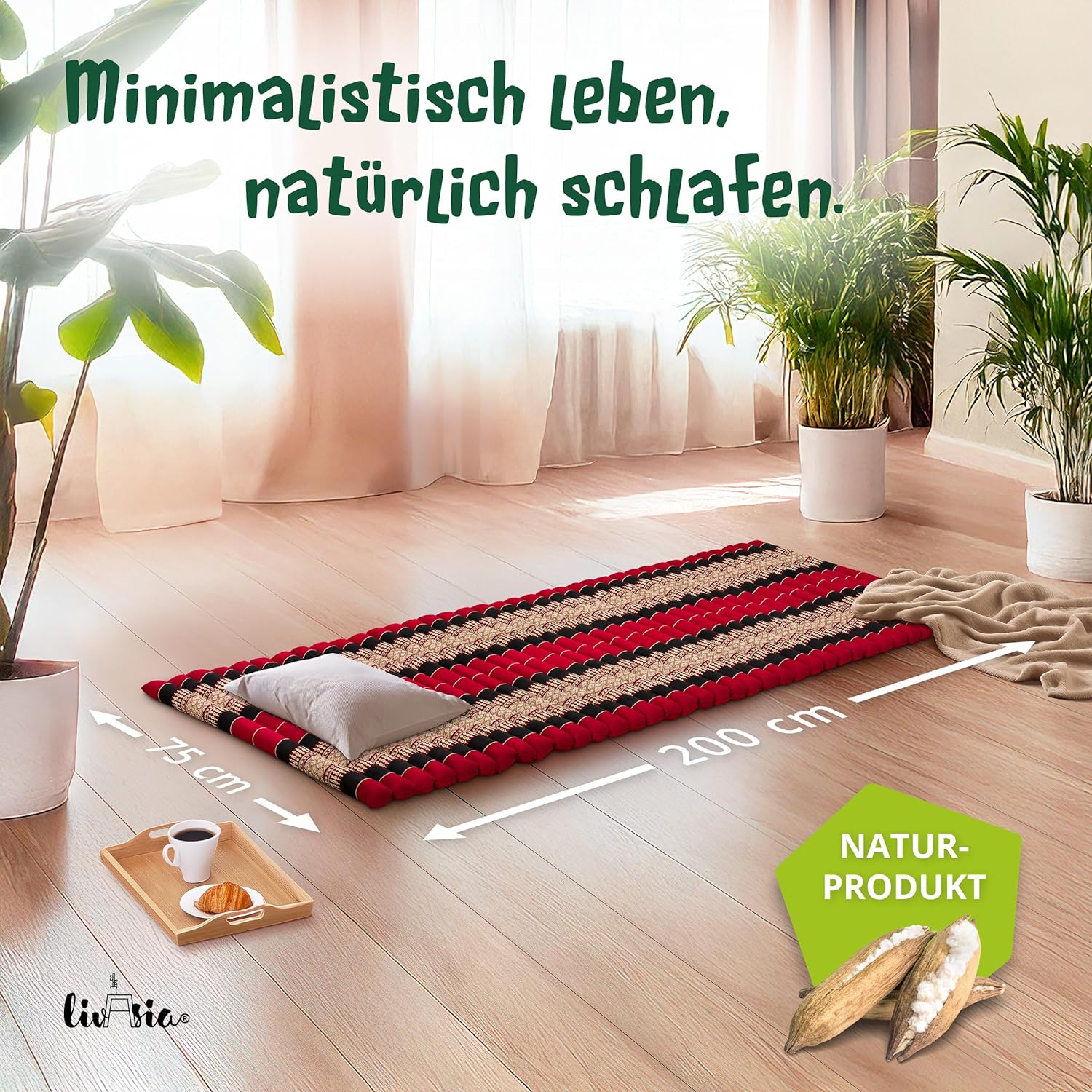 - NATÜRLICH UND NACHHALTIG: livasia Rollmatten sind mit reinem und unbehandeltem Kapok gefüllt. Die wildwachsende Pflanzendaune wird schonend von Hand geerntet und trägt zu einem gesunden Urwald bei. Der Bezug aus robuster Baumwolle macht die Thaimatte