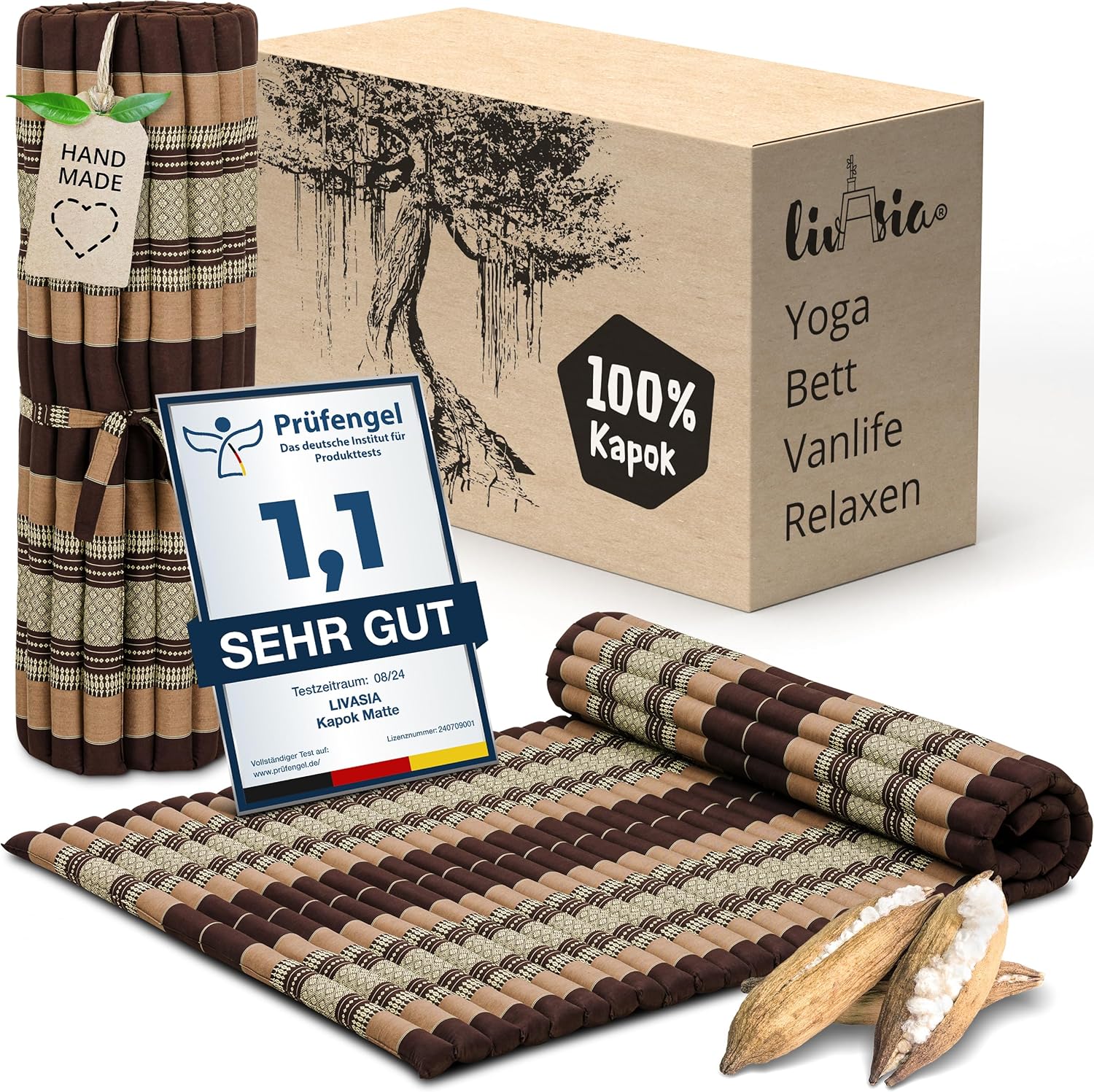• NATÜRLICH UND NACHHALTIG: livasia Rollmatten sind mit reinem und unbehandeltem Kapok gefüllt. Die wildwachsende Pflanzendaune wird schonend von Hand geerntet und trägt zu einem gesunden Urwald bei. Der Bezug aus robuster Baumwolle macht die Thaimatte