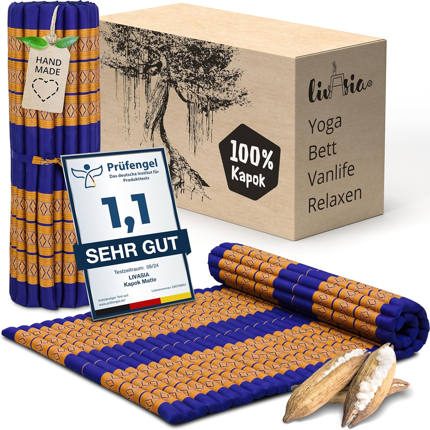 - NATÜRLICH UND NACHHALTIG: livasia Rollmatten sind mit reinem und unbehandeltem Kapok gefüllt. Die wildwachsende Pflanzendaune wird schonend von Hand geerntet und trägt zu einem gesunden Urwald bei. Der Bezug aus robuster Baumwolle macht die Thaimatte