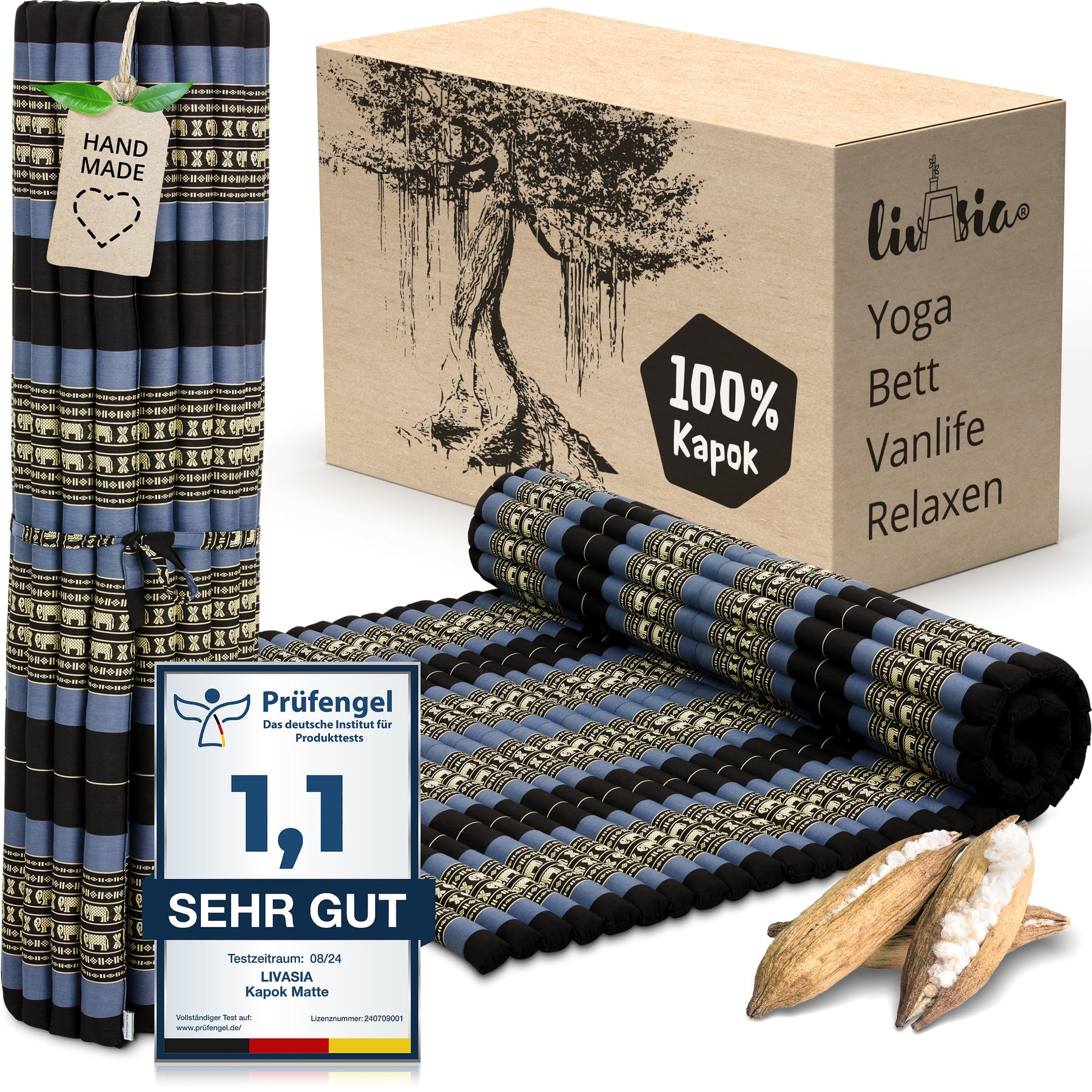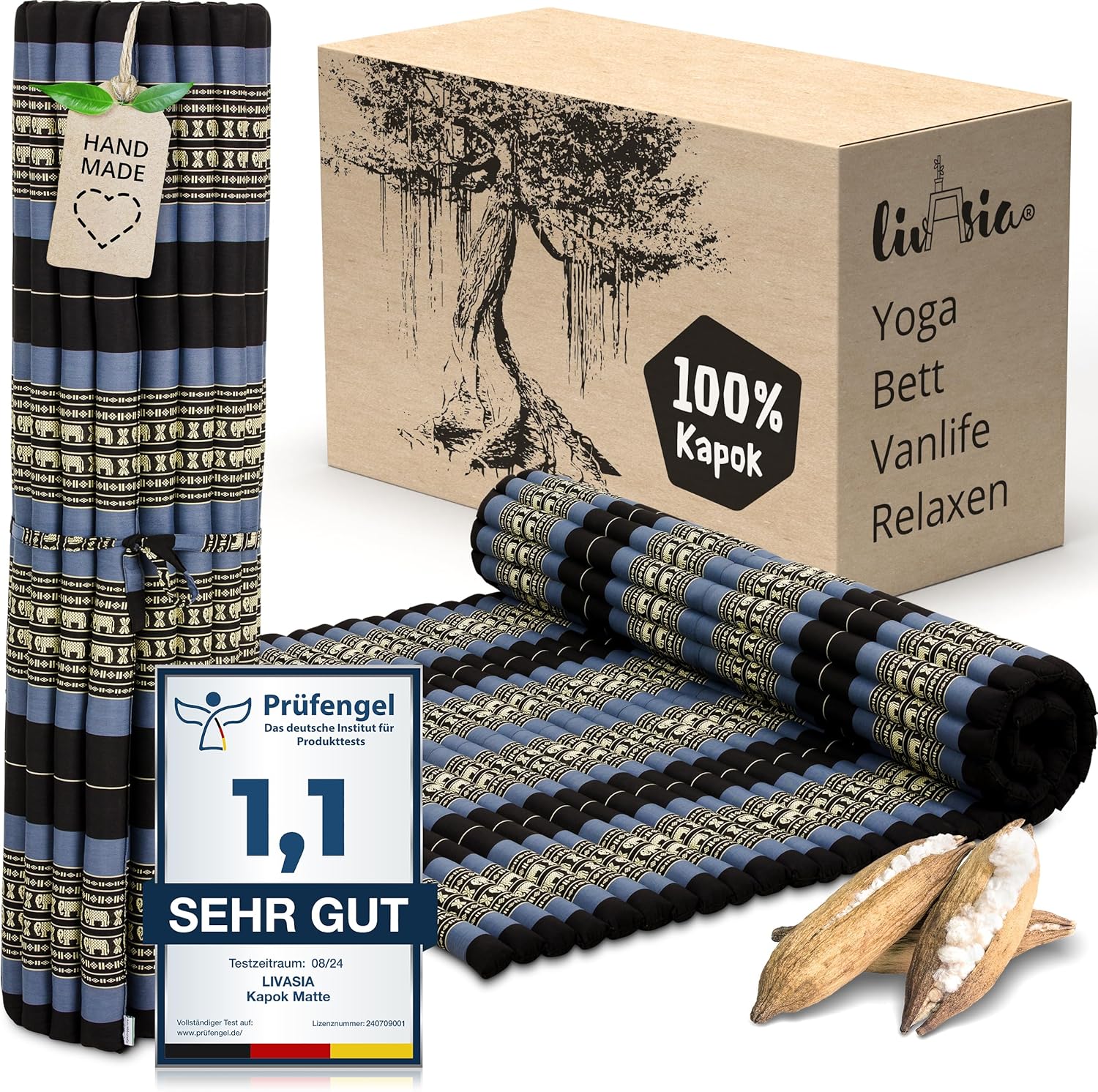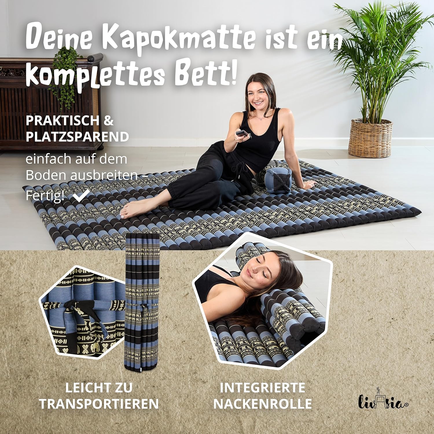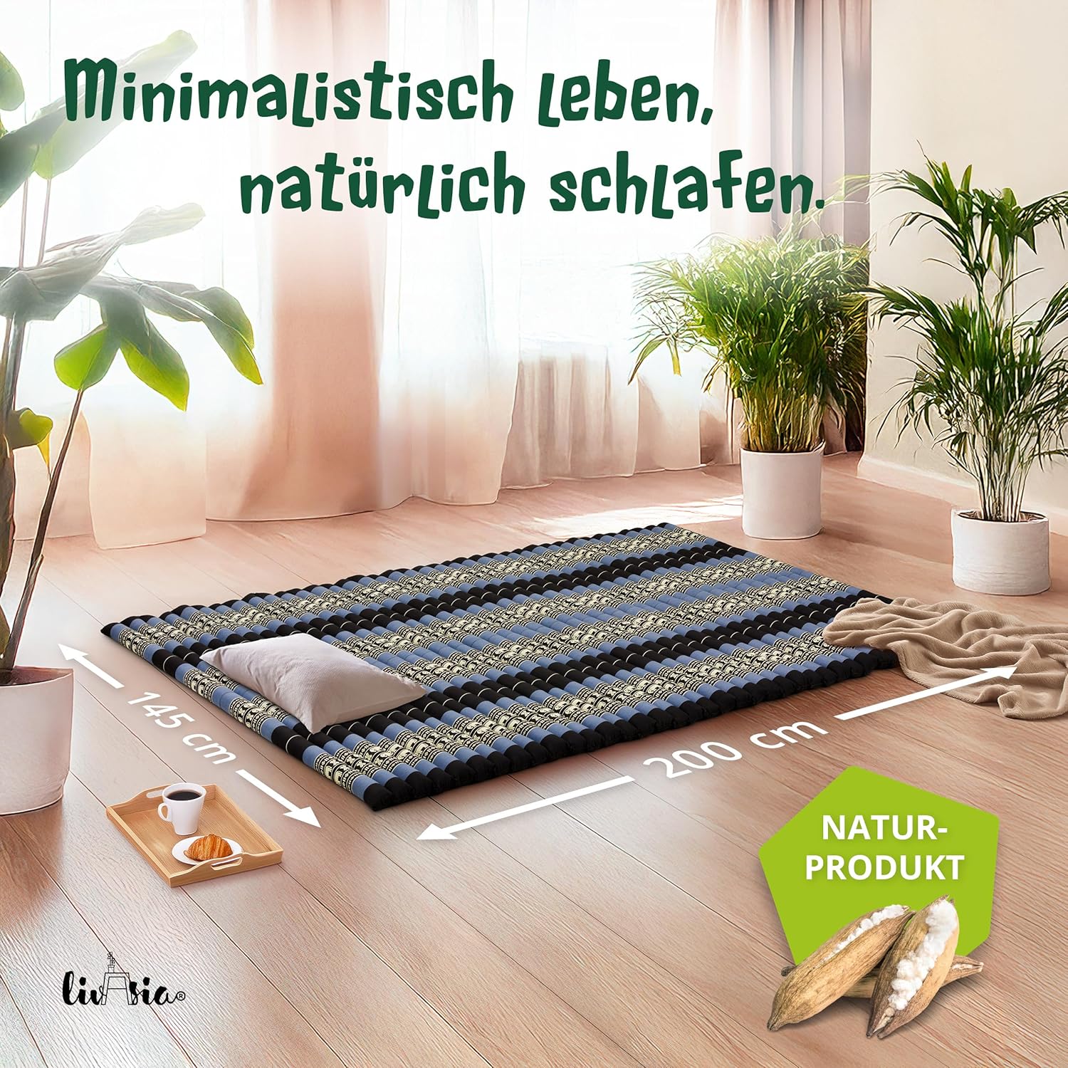 - NATÜRLICH UND NACHHALTIG: livasia Rollmatten sind mit reinem und unbehandeltem Kapok gefüllt. Die wildwachsende Pflanzendaune wird schonend von Hand geerntet und trägt zu einem gesunden Urwald bei. Der Bezug aus robuster Baumwolle macht die Thaimatte
