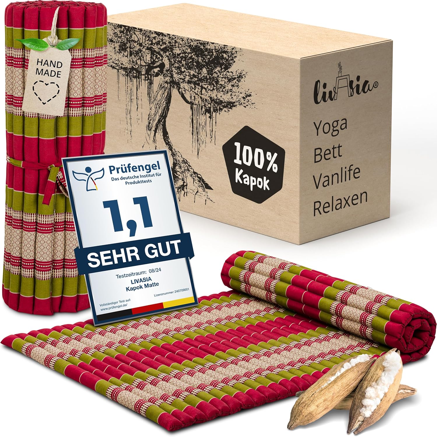 - NATÜRLICH UND NACHHALTIG: livasia Rollmatten sind mit reinem und unbehandeltem Kapok gefüllt. Die wildwachsende Pflanzendaune wird schonend von Hand geerntet und trägt zu einem gesunden Urwald bei. Der Bezug aus robuster Baumwolle macht die Thaimatte
