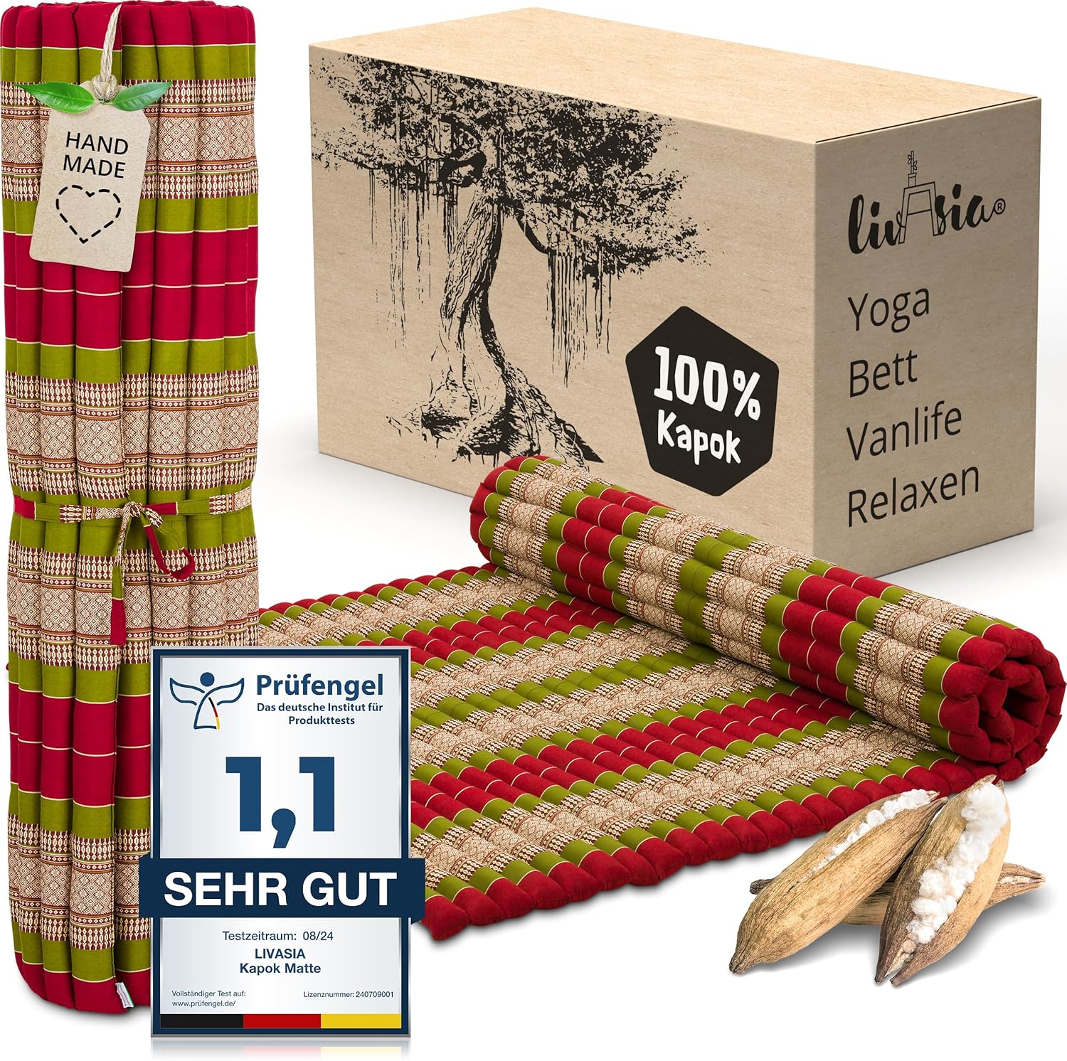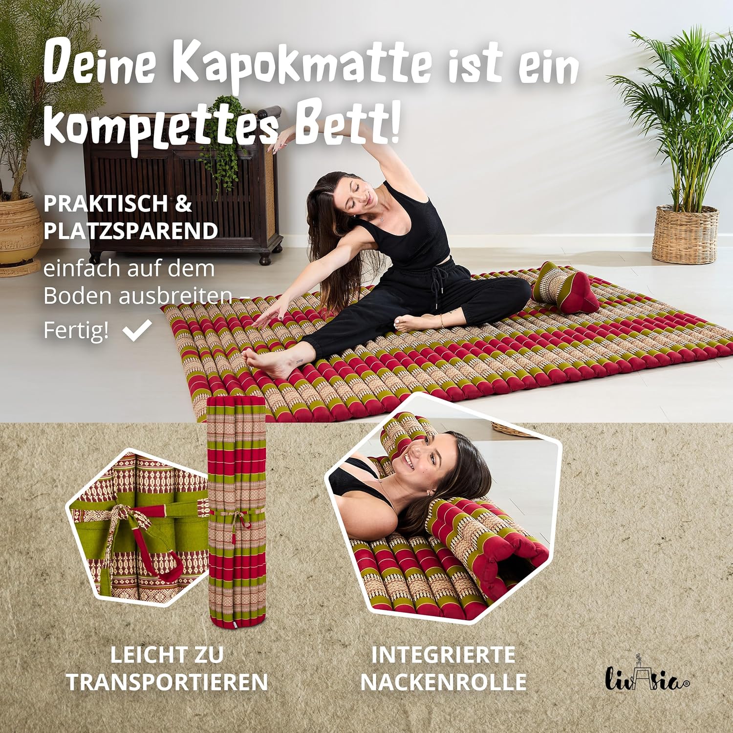 - NATÜRLICH UND NACHHALTIG: livasia Rollmatten sind mit reinem und unbehandeltem Kapok gefüllt. Die wildwachsende Pflanzendaune wird schonend von Hand geerntet und trägt zu einem gesunden Urwald bei. Der Bezug aus robuster Baumwolle macht die Thaimatte