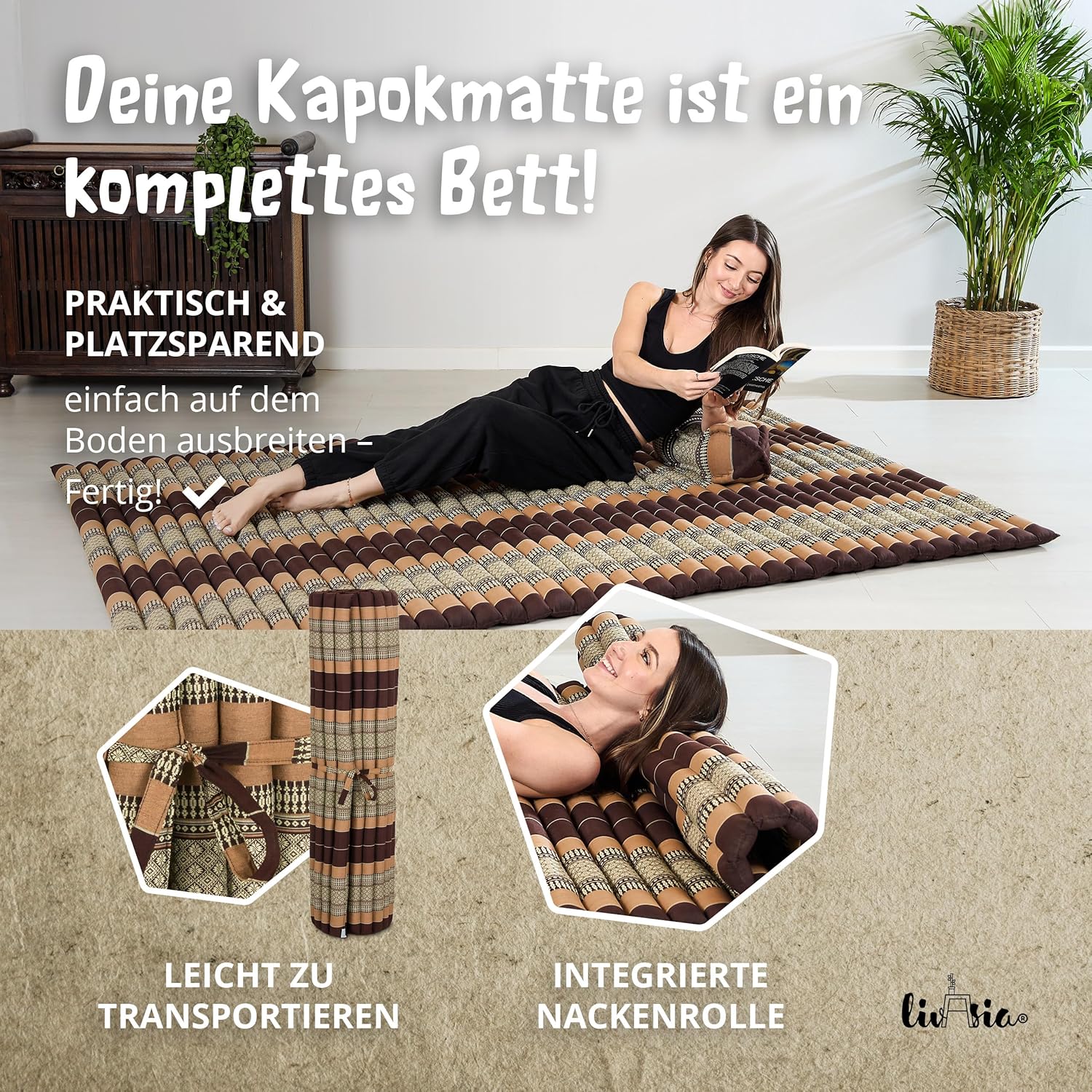 • NATÜRLICH UND NACHHALTIG: livasia Rollmatten sind mit reinem und unbehandeltem Kapok gefüllt. Die wildwachsende Pflanzendaune wird schonend von Hand geerntet und trägt zu einem gesunden Urwald bei. Der Bezug aus robuster Baumwolle macht die Thaimatte