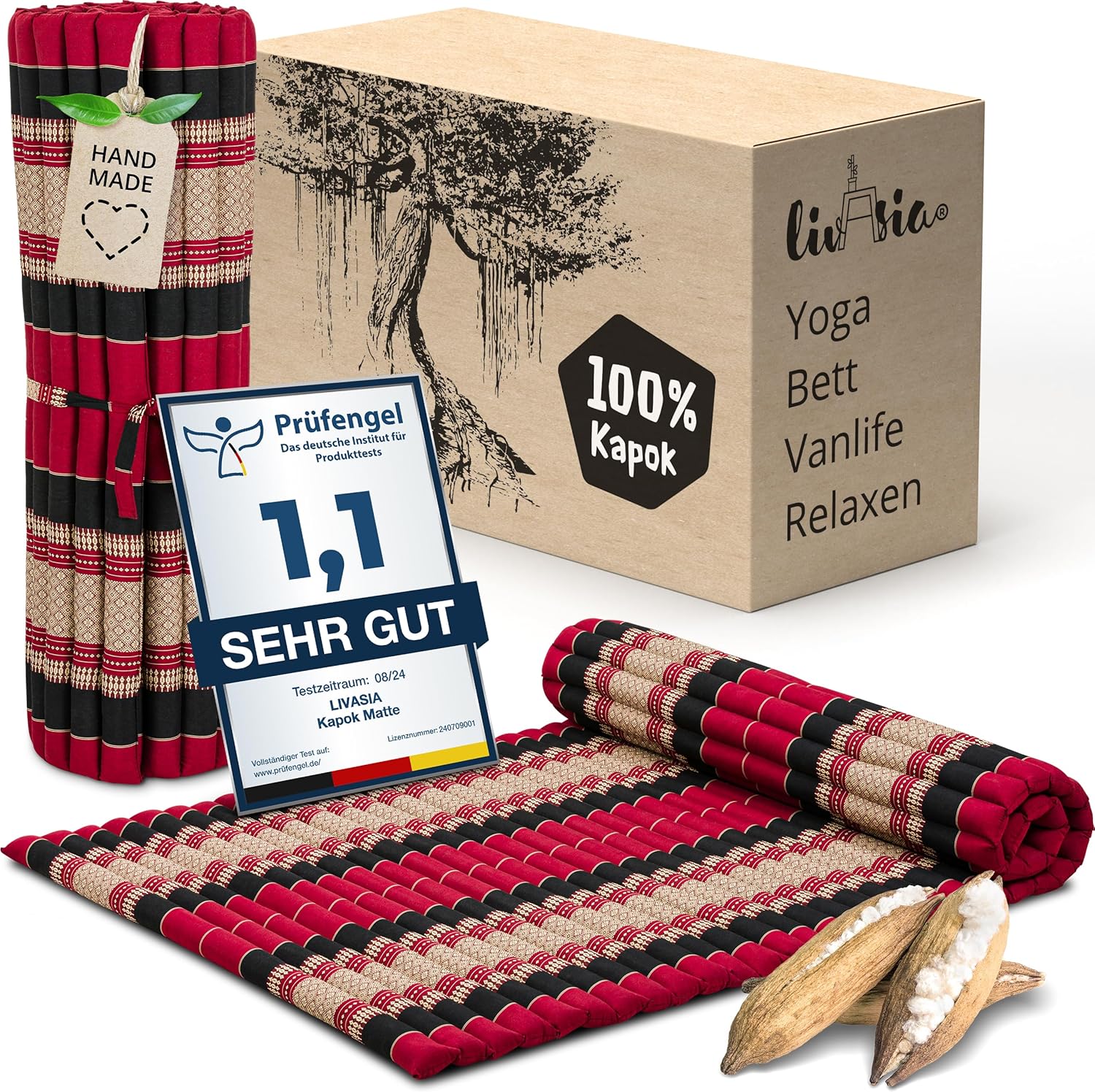 • NATÜRLICH UND NACHHALTIG: livasia Rollmatten sind mit reinem und unbehandeltem Kapok gefüllt. Die wildwachsende Pflanzendaune wird schonend von Hand geerntet und trägt zu einem gesunden Urwald bei. Der Bezug aus robuster Baumwolle macht die Thaimatte