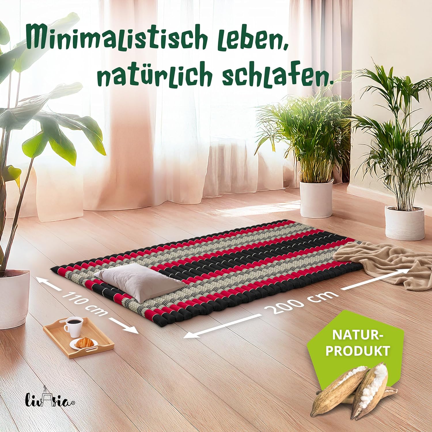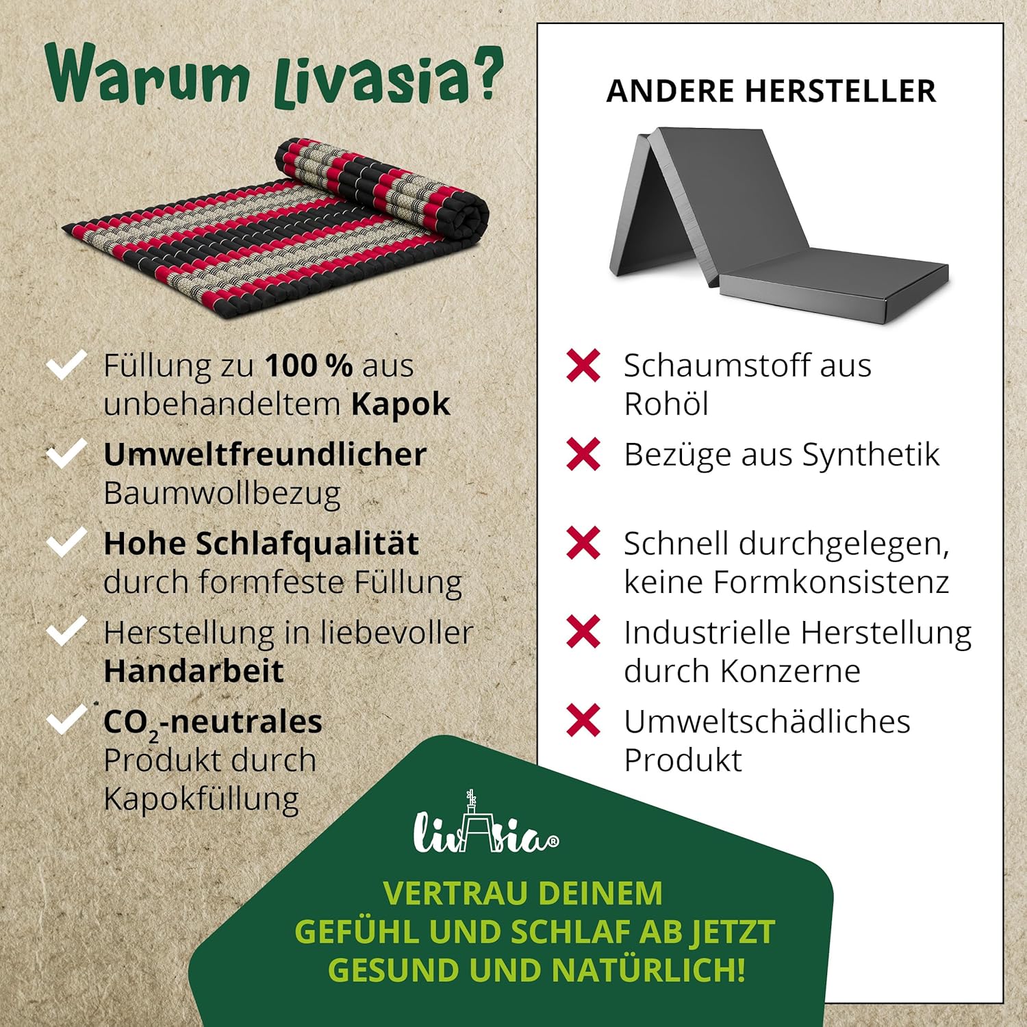 - NATÜRLICH UND NACHHALTIG: livasia Rollmatten sind mit reinem und unbehandeltem Kapok gefüllt. Die wildwachsende Pflanzendaune wird schonend von Hand geerntet und trägt zu einem gesunden Urwald bei. Der Bezug aus robuster Baumwolle macht die Thaimatte