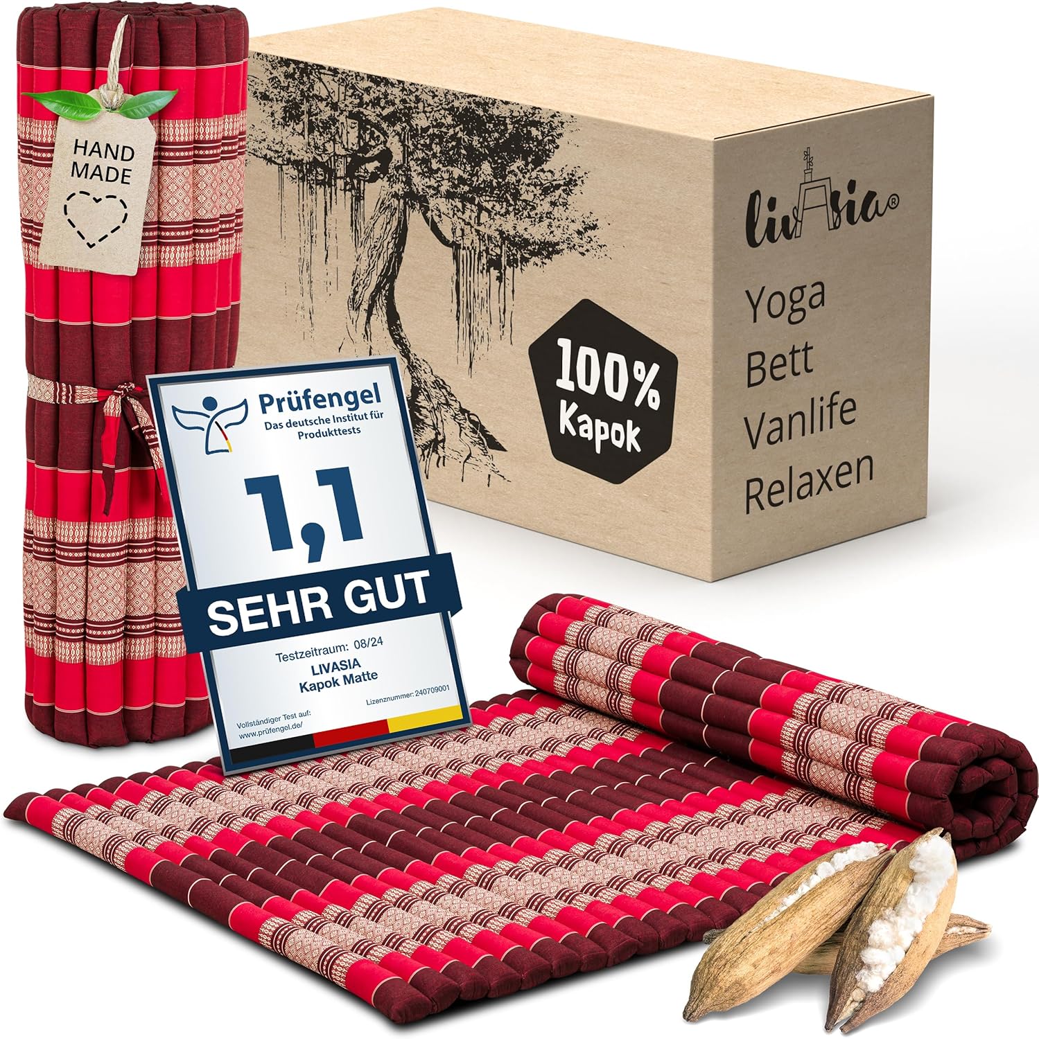 • NATÜRLICH UND NACHHALTIG: livasia Rollmatten sind mit reinem und unbehandeltem Kapok gefüllt. Die wildwachsende Pflanzendaune wird schonend von Hand geerntet und trägt zu einem gesunden Urwald bei. Der Bezug aus robuster Baumwolle macht die Thaimatte