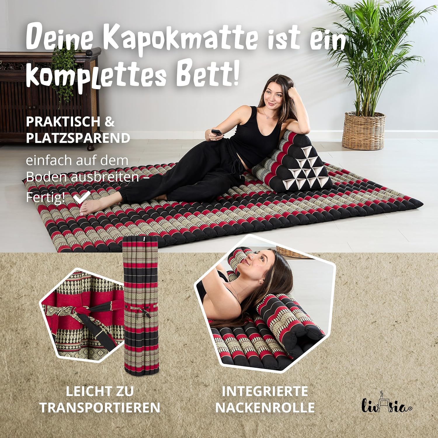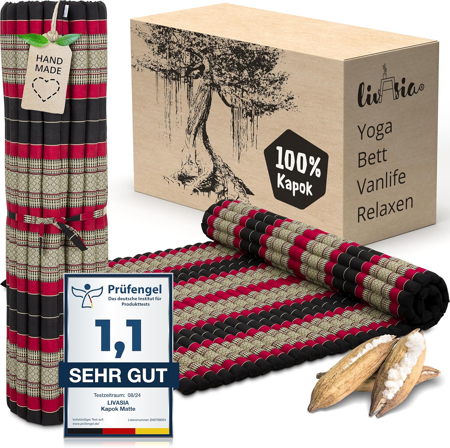 - NATÜRLICH UND NACHHALTIG: livasia Rollmatten sind mit reinem und unbehandeltem Kapok gefüllt. Die wildwachsende Pflanzendaune wird schonend von Hand geerntet und trägt zu einem gesunden Urwald bei. Der Bezug aus robuster Baumwolle macht die Thaimatte