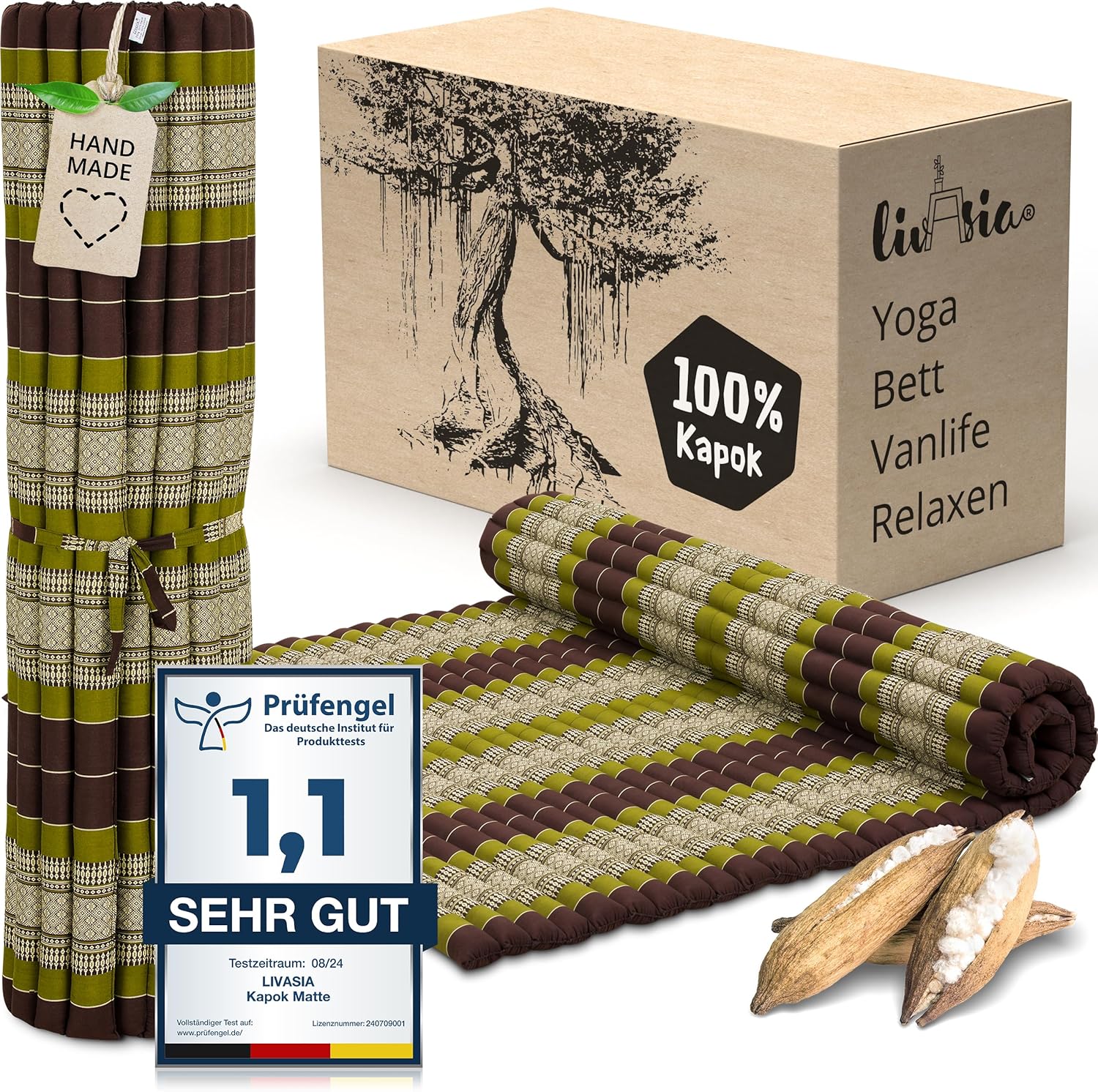 • NATÜRLICH UND NACHHALTIG: livasia Rollmatten sind mit reinem und unbehandeltem Kapok gefüllt. Die wildwachsende Pflanzendaune wird schonend von Hand geerntet und trägt zu einem gesunden Urwald bei. Der Bezug aus robuster Baumwolle macht die Thaimatte