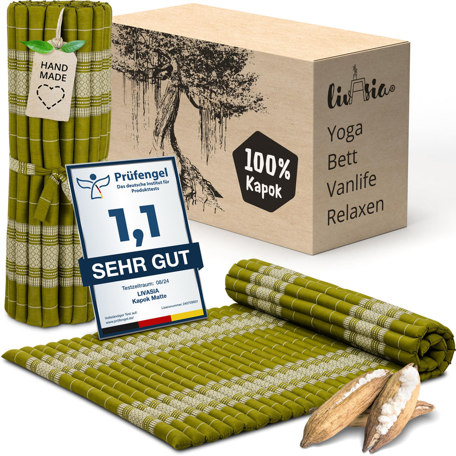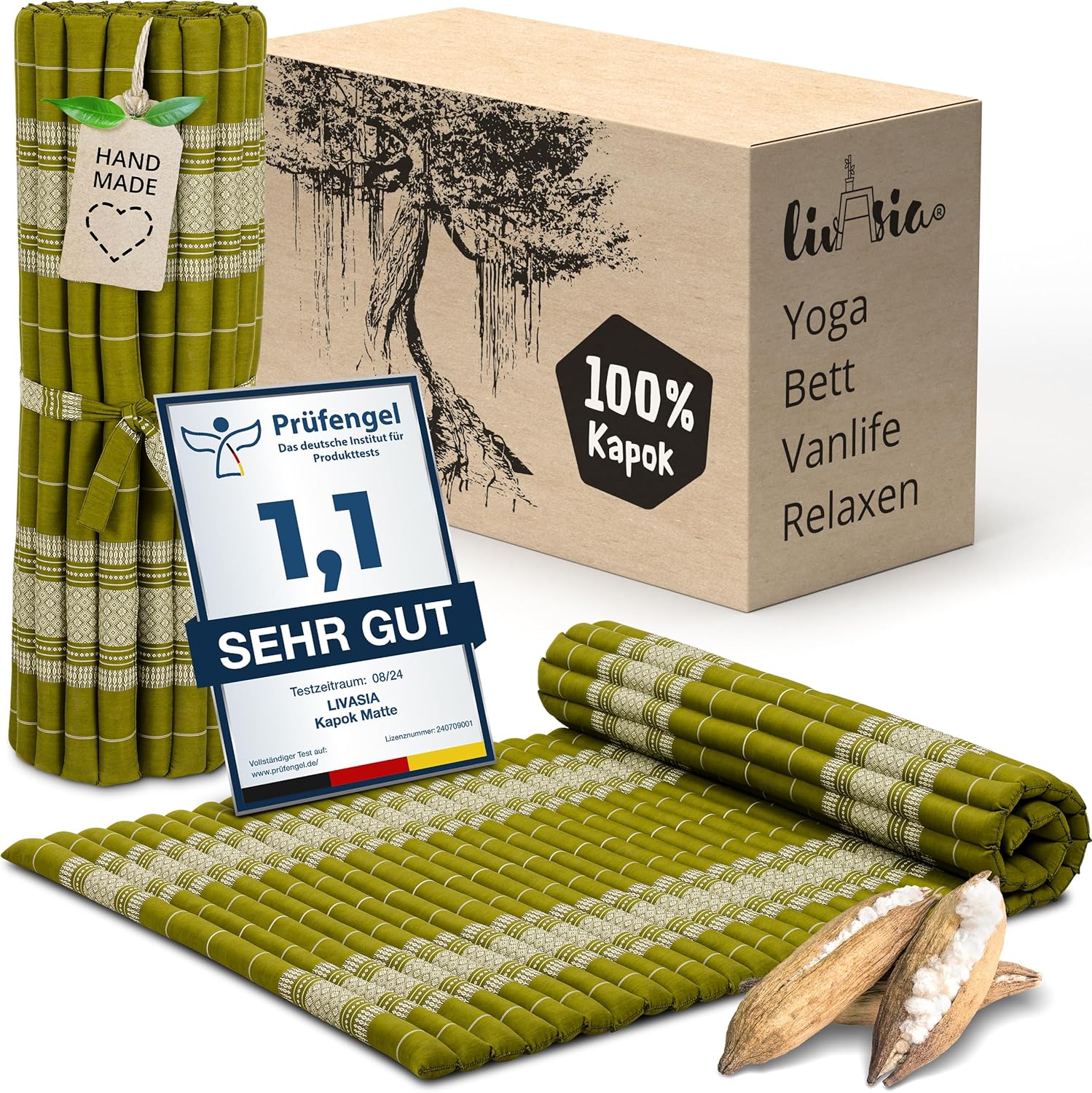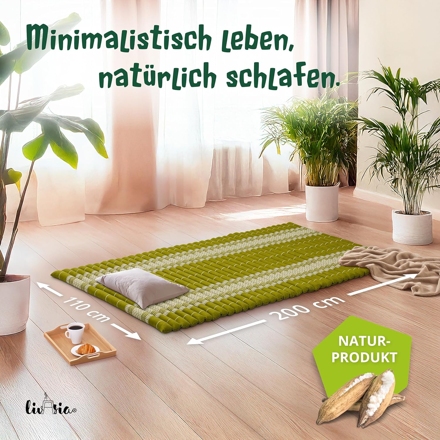 - NATÜRLICH UND NACHHALTIG: livasia Rollmatten sind mit reinem und unbehandeltem Kapok gefüllt. Die wildwachsende Pflanzendaune wird schonend von Hand geerntet und trägt zu einem gesunden Urwald bei. Der Bezug aus robuster Baumwolle macht die Thaimatte
