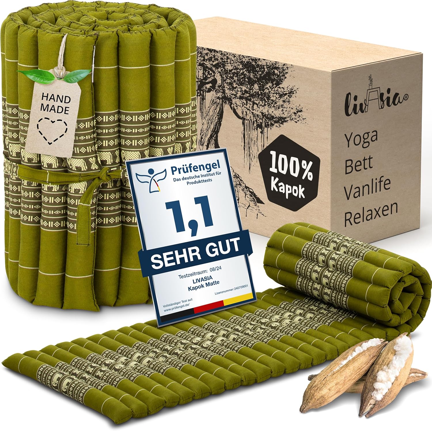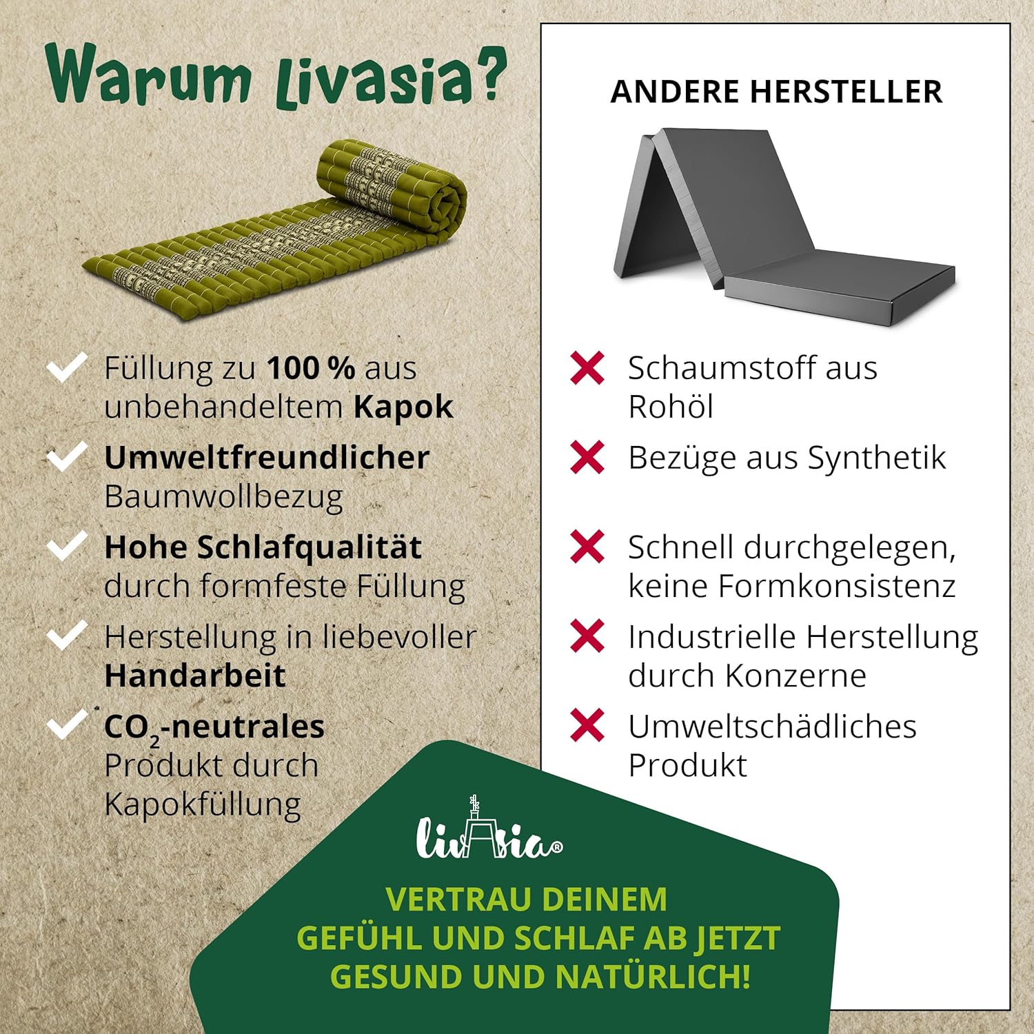 - NATÜRLICH UND NACHHALTIG: livasia Rollmatten sind mit reinem und unbehandeltem Kapok gefüllt. Die wildwachsende Pflanzendaune wird schonend von Hand geerntet und trägt zu einem gesunden Urwald bei. Der Bezug aus robuster Baumwolle macht die Thaimatte