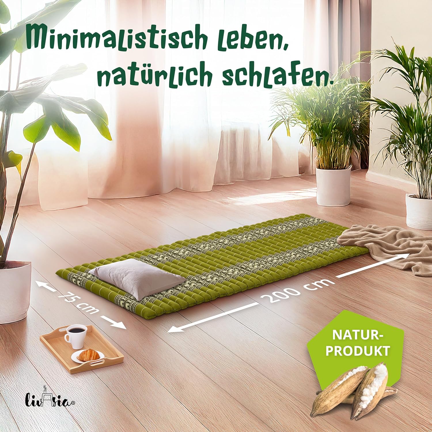 - NATÜRLICH UND NACHHALTIG: livasia Rollmatten sind mit reinem und unbehandeltem Kapok gefüllt. Die wildwachsende Pflanzendaune wird schonend von Hand geerntet und trägt zu einem gesunden Urwald bei. Der Bezug aus robuster Baumwolle macht die Thaimatte