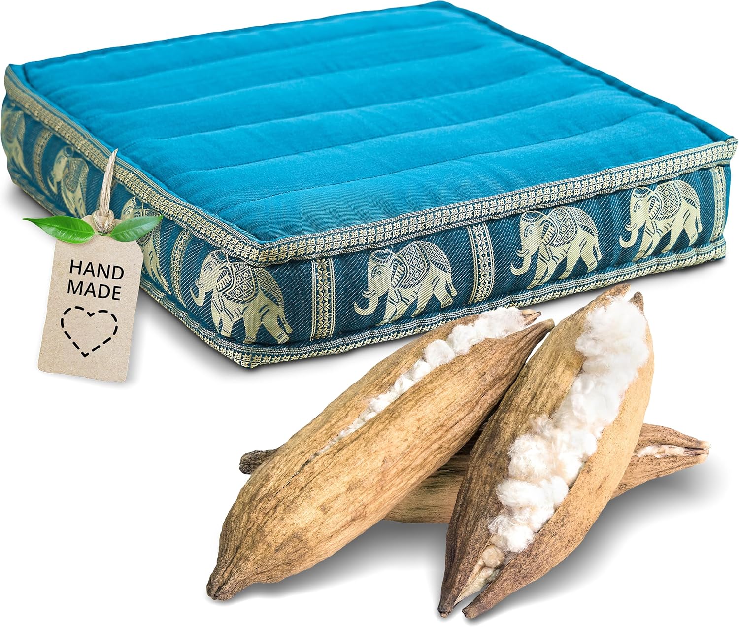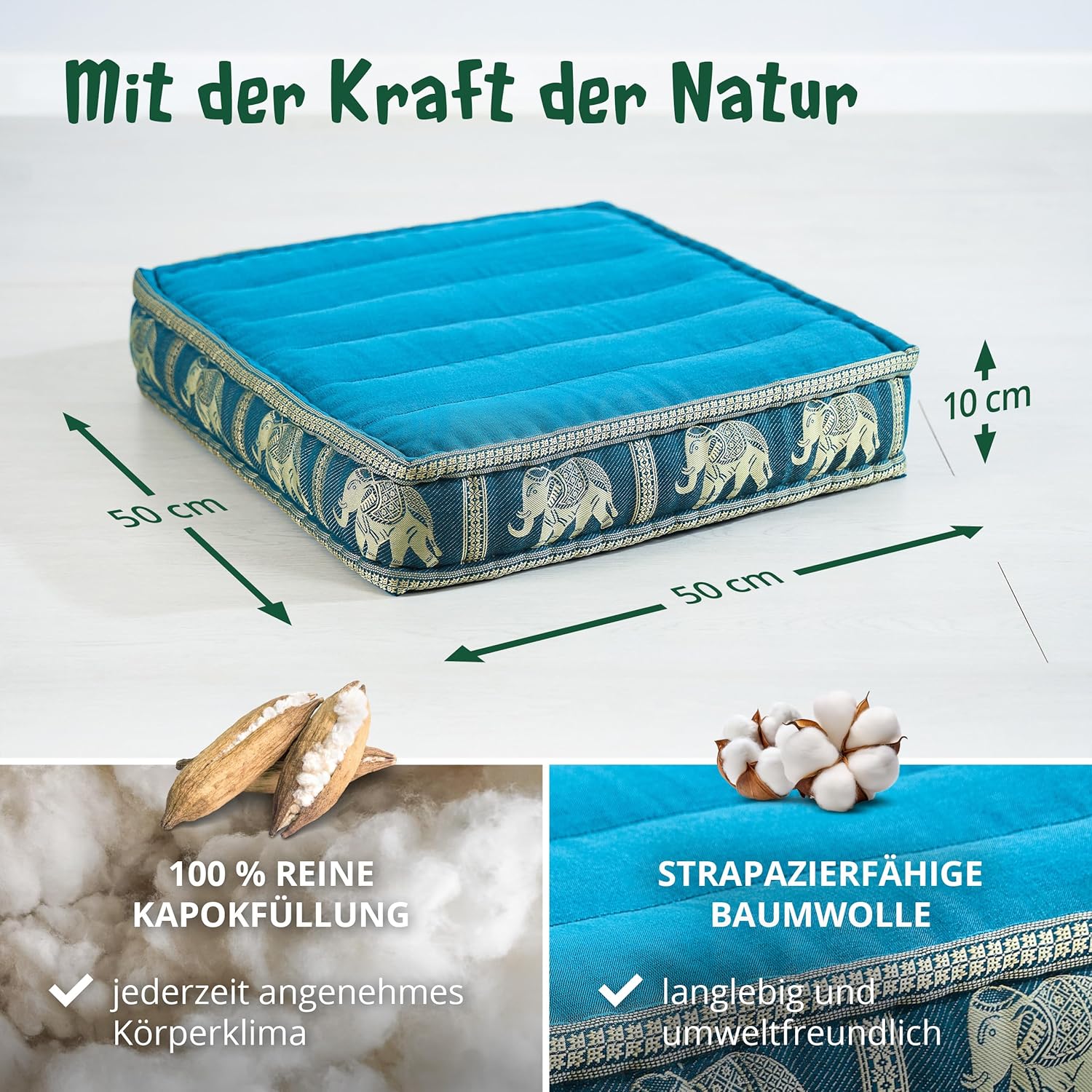 - PRAKTISCH UND VIELSEITIG: Das formfeste Kissen bleibt auch bei langem Sitzen stabil. Kombiniert mit einer Rollmatte oder einem Dreieckskissen aus Kapok, der Pflanzen-Daune, bringst du thailändische Gemütlichkeit in dein Leben. Masse Bodensitzkissen: 50