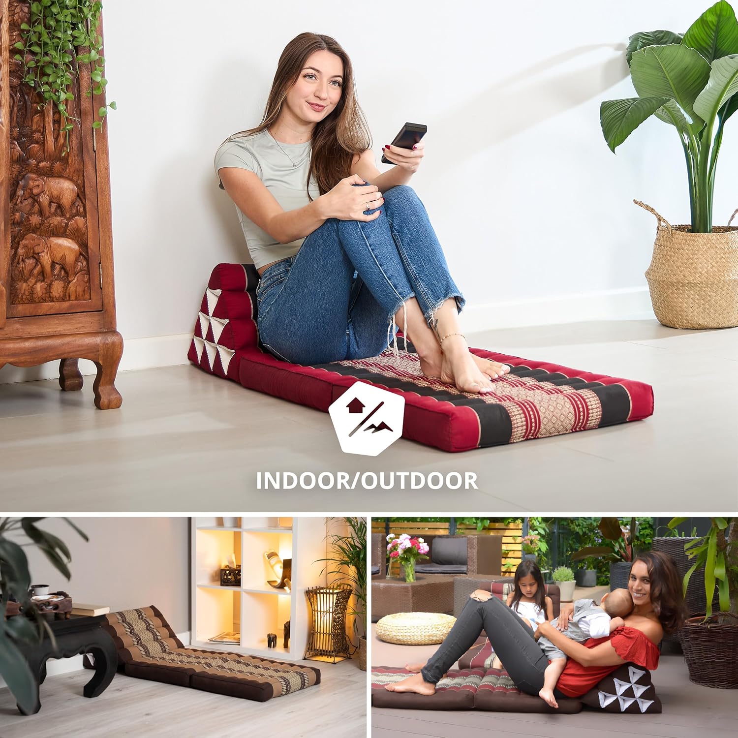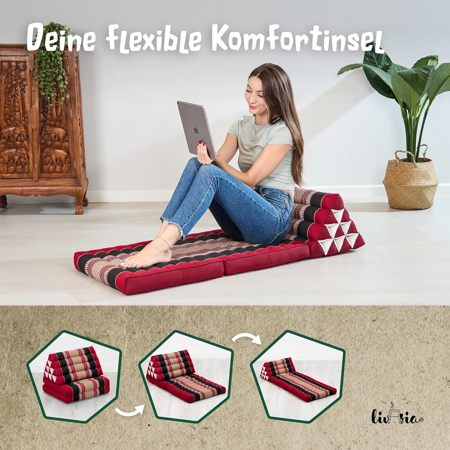 - ENTSPANNUNG IST LUXUS: Zurücklehnen und entspannen – die gemütliche Lieblingsecke wird zur asiatischen Wohlfühl-Oase mit dem praktischen Thaikissen. Die zwei faltbaren Auflagen werden mit einem Handgriff zu einer einladenden Liegefläche. Wird sie nicht gebraucht, lässt sie sich platzsparend zusammenklappen. Das Dreieckskissen ist mit authentischer Thai-Stickerei versehen. Yoga, Meditation, Fernsehen oder ein gutes Buch geniessen, das vielseitige Kissen lädt zur Erholung ein.