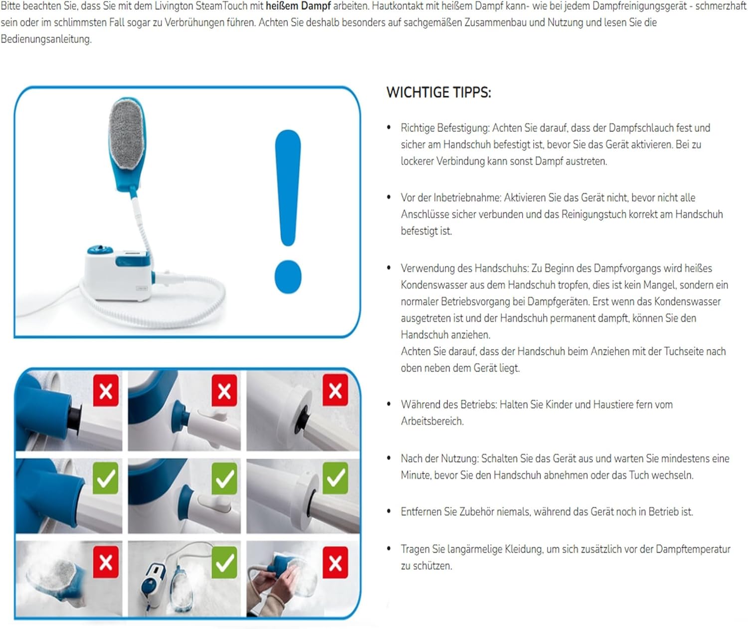 - MAXIMALE SICHERHEIT & NACHHALTIGKEIT: Dank des hitzebeständigen Silikon-Handschuhs wird eine sichere Anwendung garantiert. Livington SteamTouch ist schonend für Mensch, Tier und Umwelt.