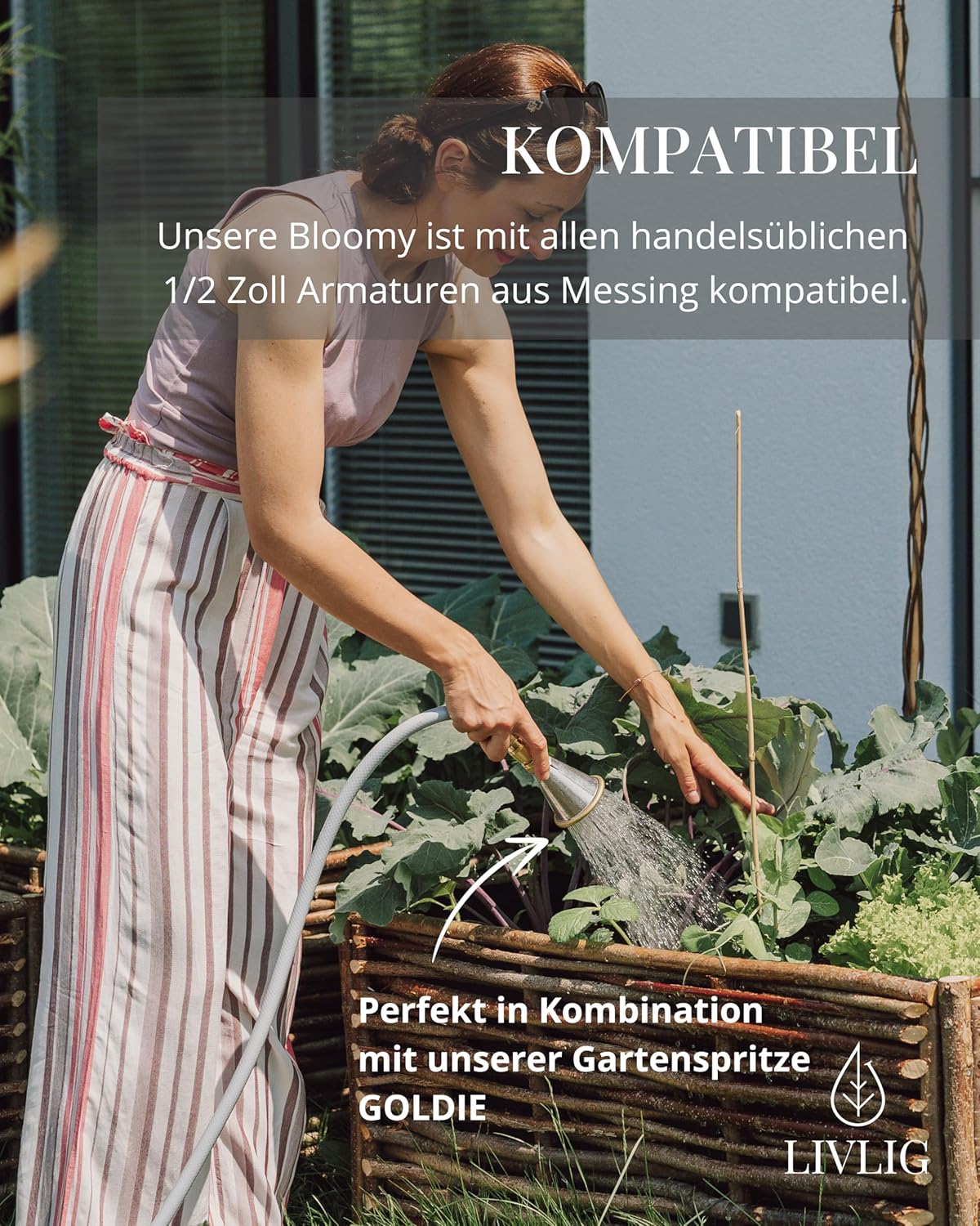 - Kompatibel: Unsere Bloomy besitzt einen Schlauchanschluss aus Messing und ist sie zu allen marktüblichen Messing-Stecksystemen kompatibel. Das Wasser tritt gleichzeitig aus vielen Einzeldüsen aus – das Giesskannengefühl zum Bewässern von grossen