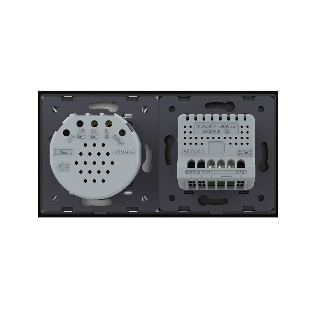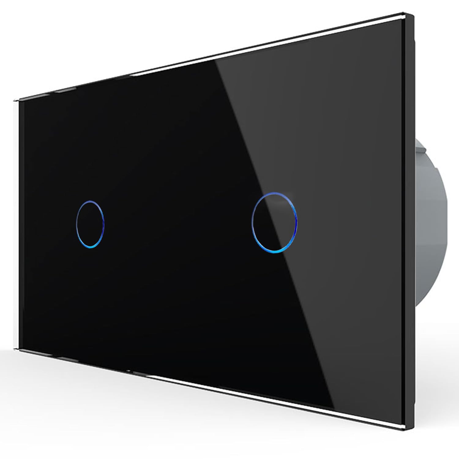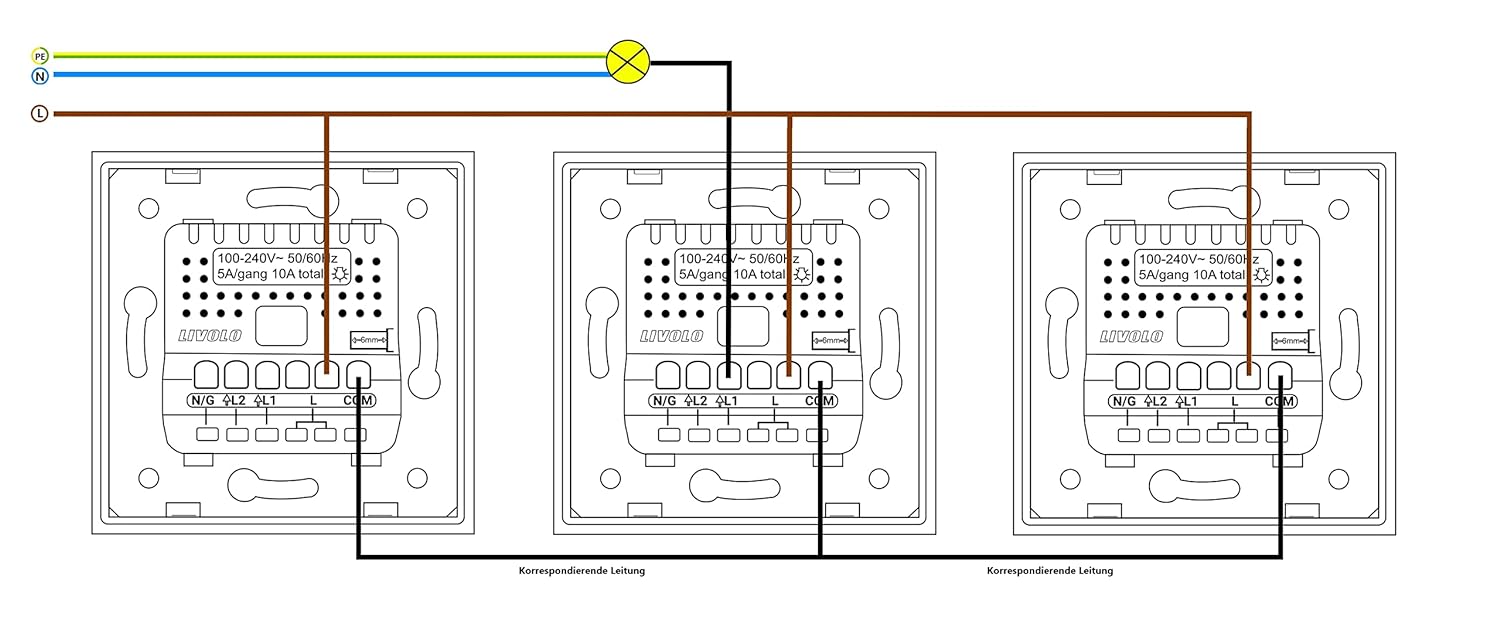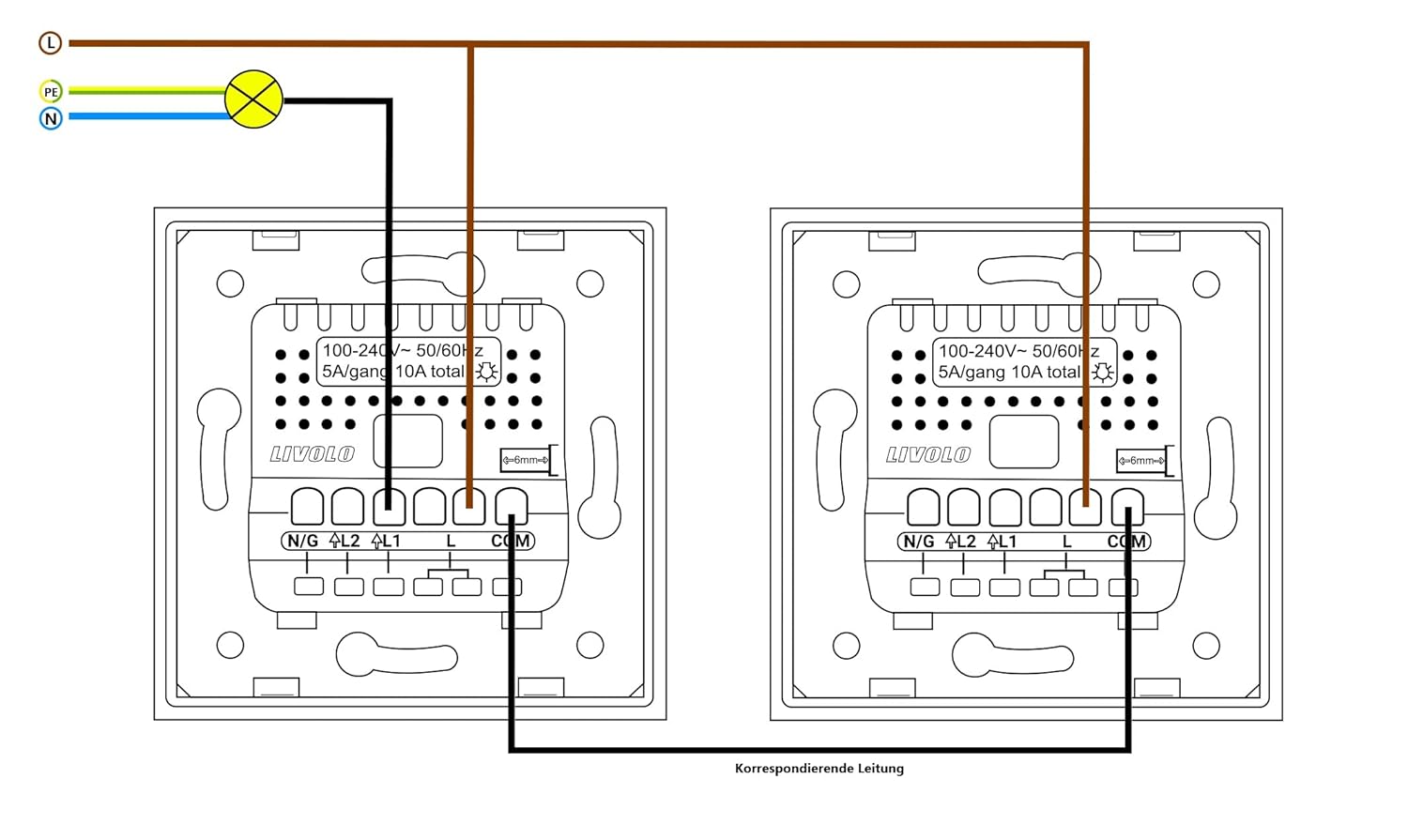 PRODUKTBESCHREIBUNGEN Diese Kombination besteht aus einem einfachen Livolo Lichtschalter, zum ein- und ausschalten einer Leuchte bzw. Leuchtengruppe und einem Wechsel-/Kreuzschalter zum ein- und ausschalten einer Leuchte von unterschiedlichen Stellen aus. Verbunden werden diese durch eine 2-fache Glasblende. Die Livolo Touch-Wechselschalter können gleichzeitig auch als Kreuzschalter verwendet werden. Der Anschluss aller korrespondierender Kabel der weiteren Touch-Wechselschalter erfolgt zusammen im COM-Anschluss des Schalters, der als Kreuzschalter verwendet wird. Die Synchronisationsanleitung finden Sie in der Bedienungsanleitung. Durch die Glasblende werden diese Schalter mit moderner Sensortechnik zu einem echten Hingucker. Einfache und schnelle Montage, sowohl vertikal als auch horizontal. Durch leichtes Berühren der Kreisfläche wird der Lichtschalter betätigt. Die Kontur der Berührungsfläche ist dezent beleuchtet, so dass eine einfache Bedienung zu jeder Tageszeit möglich ist. Vor allem im Dunkeln ist es einfach den Schalter zu finden. Im An-Modus leuchtet die Umrandung des Touchfeldes Rot, im Aus-Modus Blau. Unsere Touch- Lichtschalter können mit allen Arten von Lampen verwendet werden, einschliesslich Glühlampen, Halogenlampen & Energiesparlampen. Ausnahme: LED-Strips. Achtung: Bei Leuchten unter 20 Watt kann es zu Störungen kommen. In diesem Fall hilft in fast allen Fällen ein Widerstandsadapter. Bei unseren LED Deckenspots benötigen Sie keinen Widerstandsadapter! Im unseren Shop finden Sie auch Spreizkrallen im 2er Pack, für Unterputzdosen ohne Verschraubungsmöglichkeit. Geeignet für Hohlwände und ältere Häuser. Bei Verwendung von Spreizkrallen sind 68 mm grosse Unterputzdosen besser geeignet. Die Module werden mittels der beiliegenden Metallrahmen durch Schrauben an den Unterputzdosen befestigt. Fragen? Rufen Sie uns an oder senden Sie uns eine E-Mail. Wir beraten Sie gerne! Mehr