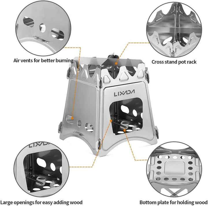 - đăTragbarer Campingkocheră Der zusammenklappbare Camping-Holzofen von Lixada besteht aus lebensmittelechtem, korrosionsbestĂ€ndigem Edelstahl. Dieser Holzofen funktioniert gut unter schweren GegenstĂ€nden oder hohen Temperaturen, hat eine