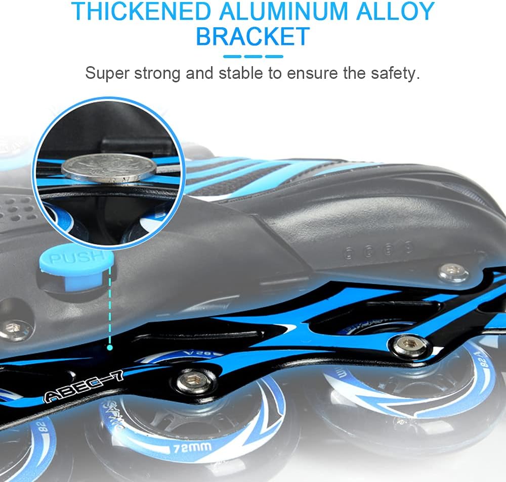 - đăErweiterbar LĂ€ngeăMit einem eleganten und auffĂ€lligen Knopf an der Seite der Inline-Skates können Sie die LĂ€nge der Outdoor-Inline-Skates.Um die Grösse anzupassen, damit diese Skates lĂ€nger als eine Saison verwendet werden.Sie können die