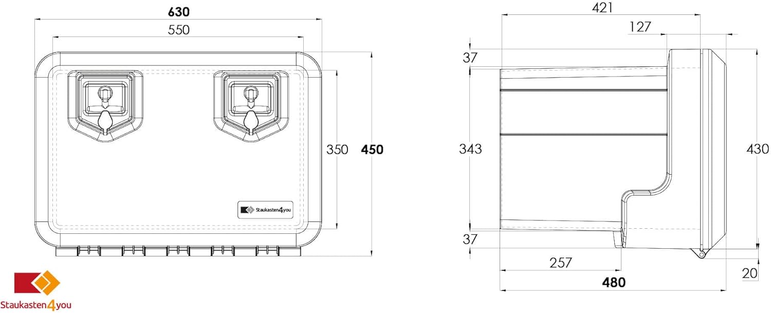 • Aussenmasse: 630 x 450 x 480 mm (B x H x T) siehe Skizze