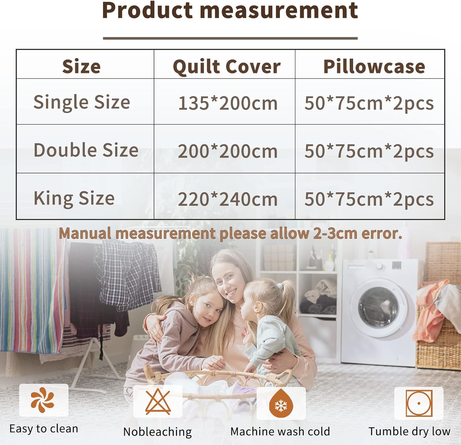 - 【Paket beinhaltet und Grösse】 Einzelgrösse: 1 Pcs Bettbezug 135 x 200 cm + 2 Pcs Kissenbezug 50 x 75 cm; doppelte Grösse: 1 Pcs Bettbezug 200 x 200 cm + 2 Pcs Kissenbezug 50 x 75 cm; König Grösse: 1 Pcs Bettbezug 220 x 240 cm + 2 Pcs Kissenbezug