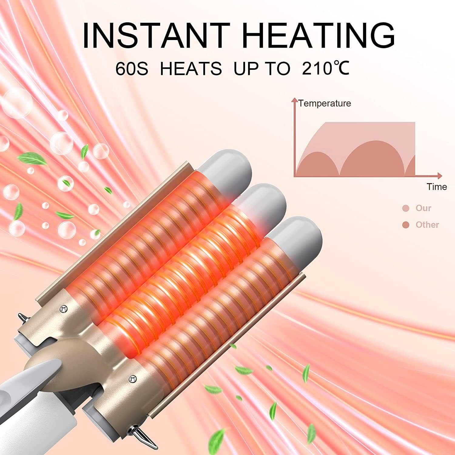- 💕💕【 PTC Keramiktechnologie 】Dieser 3-Barrel-Lockenstab und Lockenwickler besteht aus einem speziellen PTC-Heizelement aus Keramikglasur und kann schnell erhitzt werden (nur 30 Sekunden, wodurch das Haar sehr glatt und glänzend wird. Sie halten