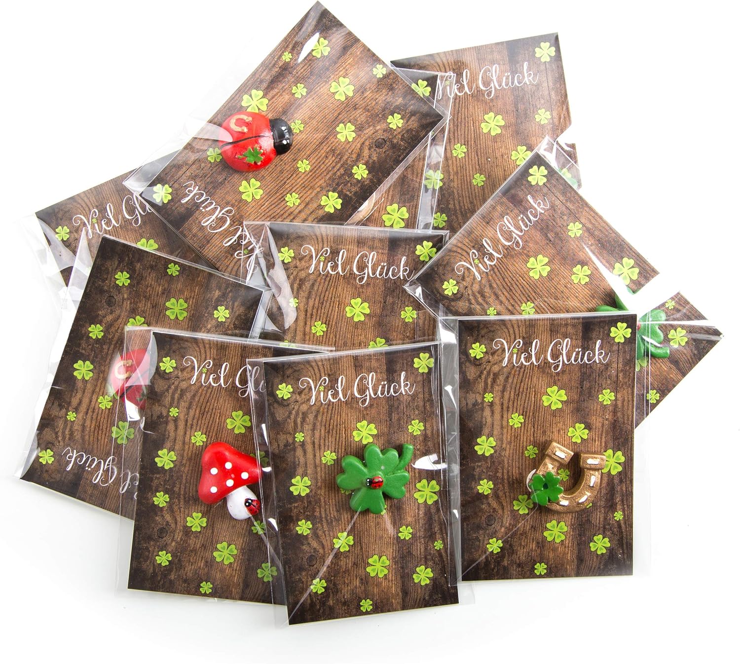 - Die kleinen Glücksbringer (Kleeblatt, Hufeisen, Fliegenpilz & Marienkäfer) werden zusammen mit einem kleinen Kärtchen verpackt in einem transparenten Folienbeutel.
