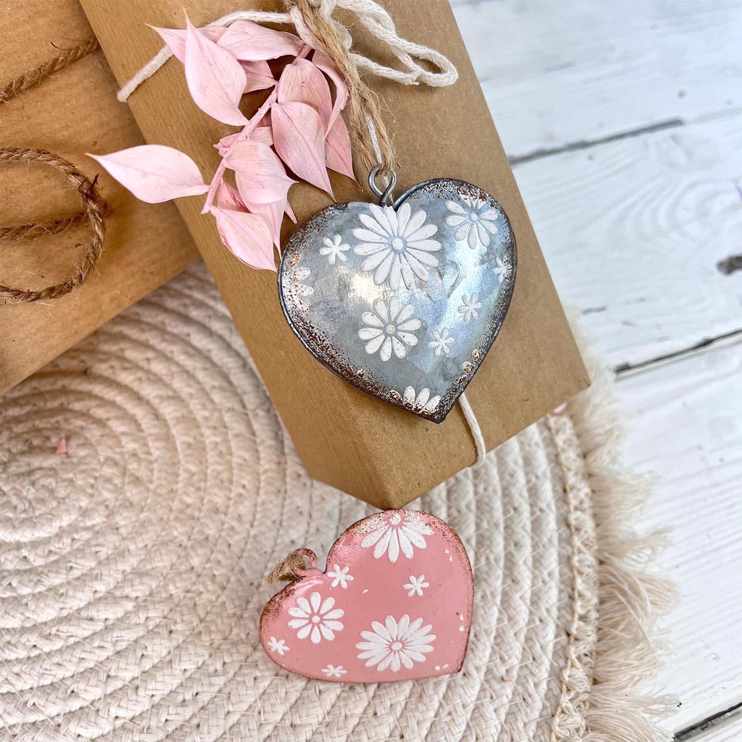 - Hochwertige Frühlingsanhänger in Form von Herzen aus Metall mit Schnur zum Aufhängen. Im Set enthalten sind Herzen in den Farben silber, rosa, hellblau und hhellgrün - jeweils verziert mit weissen Blümchen