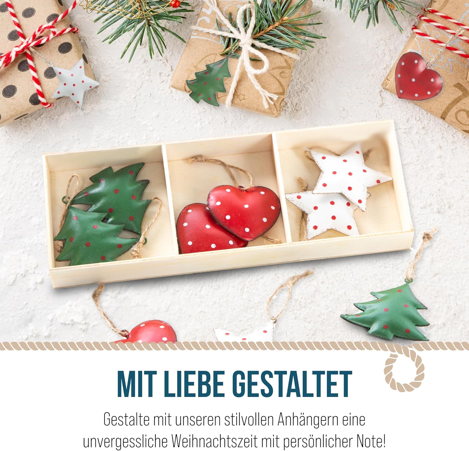 - Tolles Weihnachtsanhänger Set bestehend aus 4 Herzen, 4 Bäumen und 4 Sternen mit Schnur zum Aufhängen. Farbe: rot, weiss, grün.