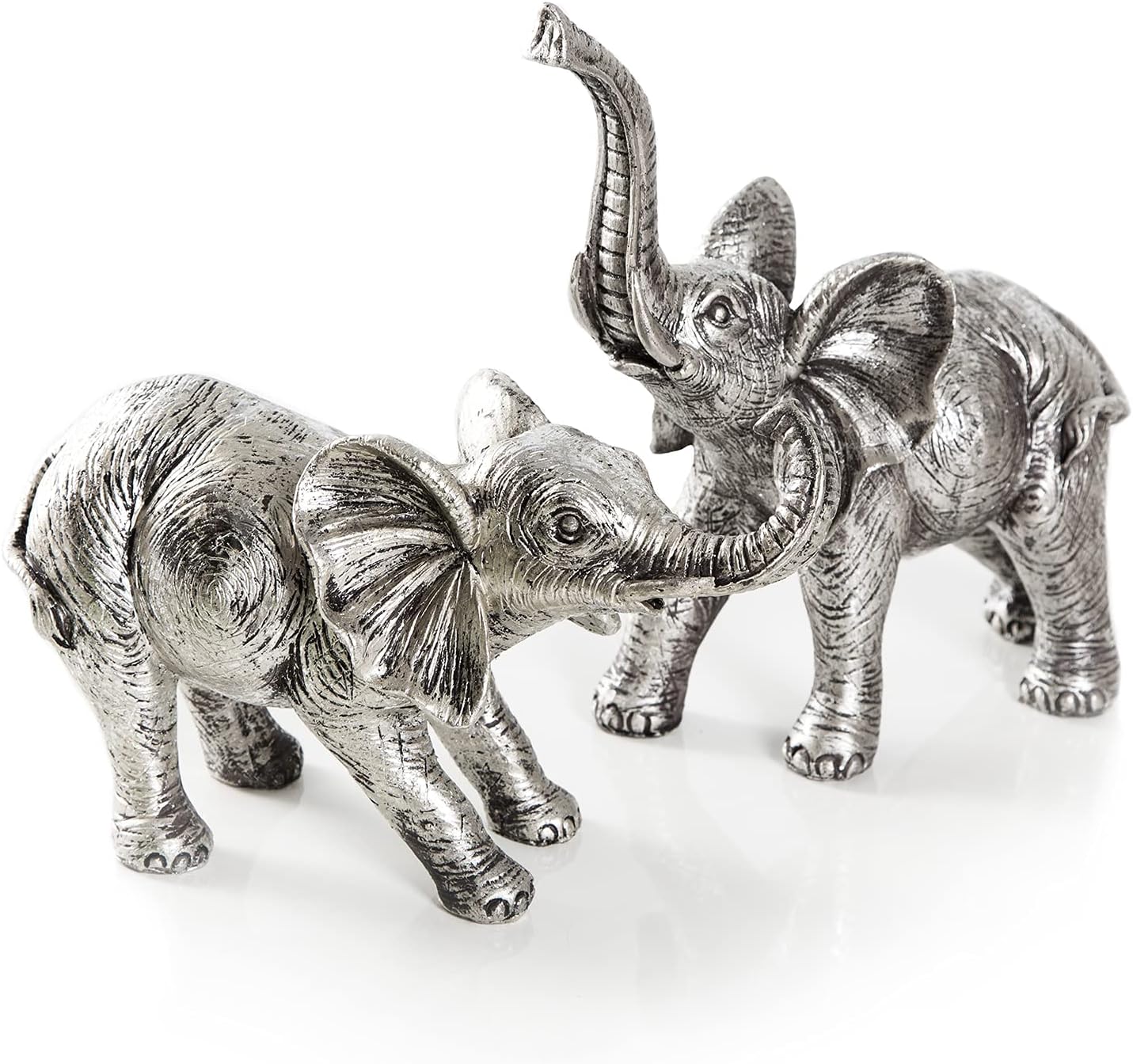 - Die Elefanten bestehen aus dem stabilen Material Polyresin. Farbe: silber, schwarz. Der Elefanten mit ausgestrecktem Rüssel ist 22,5 cm hoch, der zweite Elefant ist ca. 14 cm gross.