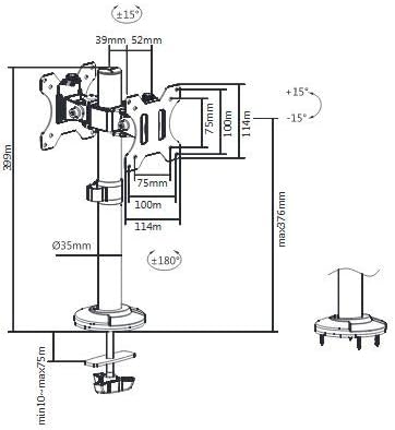 - Neigung: -15°/+15°, Schwenkung: -15°/+15°, Frontplatte drehbar: 360° - Masse Frontplatte BxH: 114x114 mm - VESA-Kompatibilität: 75x75, 100x100 - Mast-Höhe: 399 mm, Mast-Durchmesser: 35 mm