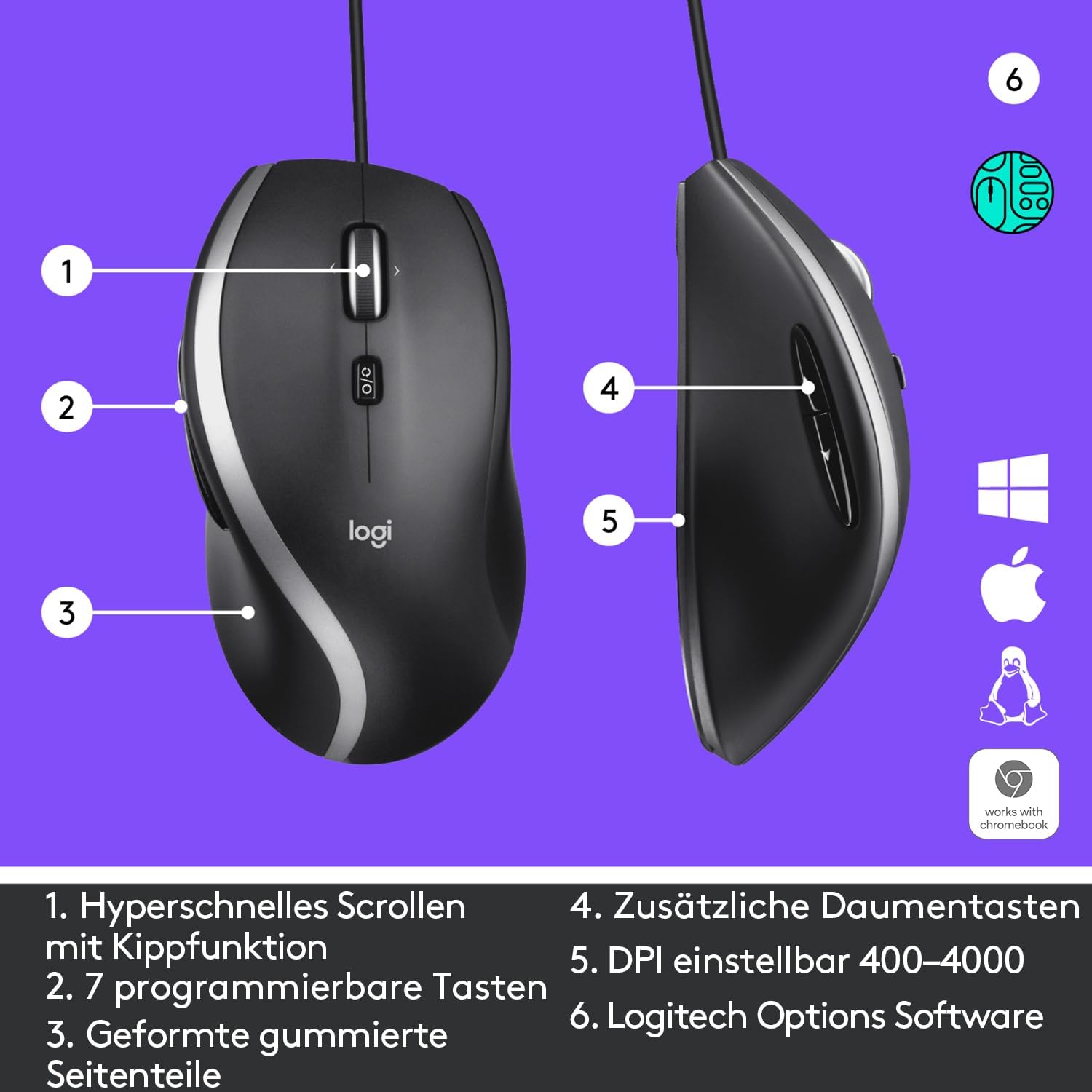 - SIEBEN ANPASSBARE TASTEN – Passen Sie die sieben programmierbaren Tasten mit der Logitech Options Software an für effiziente, aufgabenspezifische Tastenbefehle wie Rückwärts-/Vorwärts-Navigation, Kopieren/Einfügen, Musiksteuerung und mehr