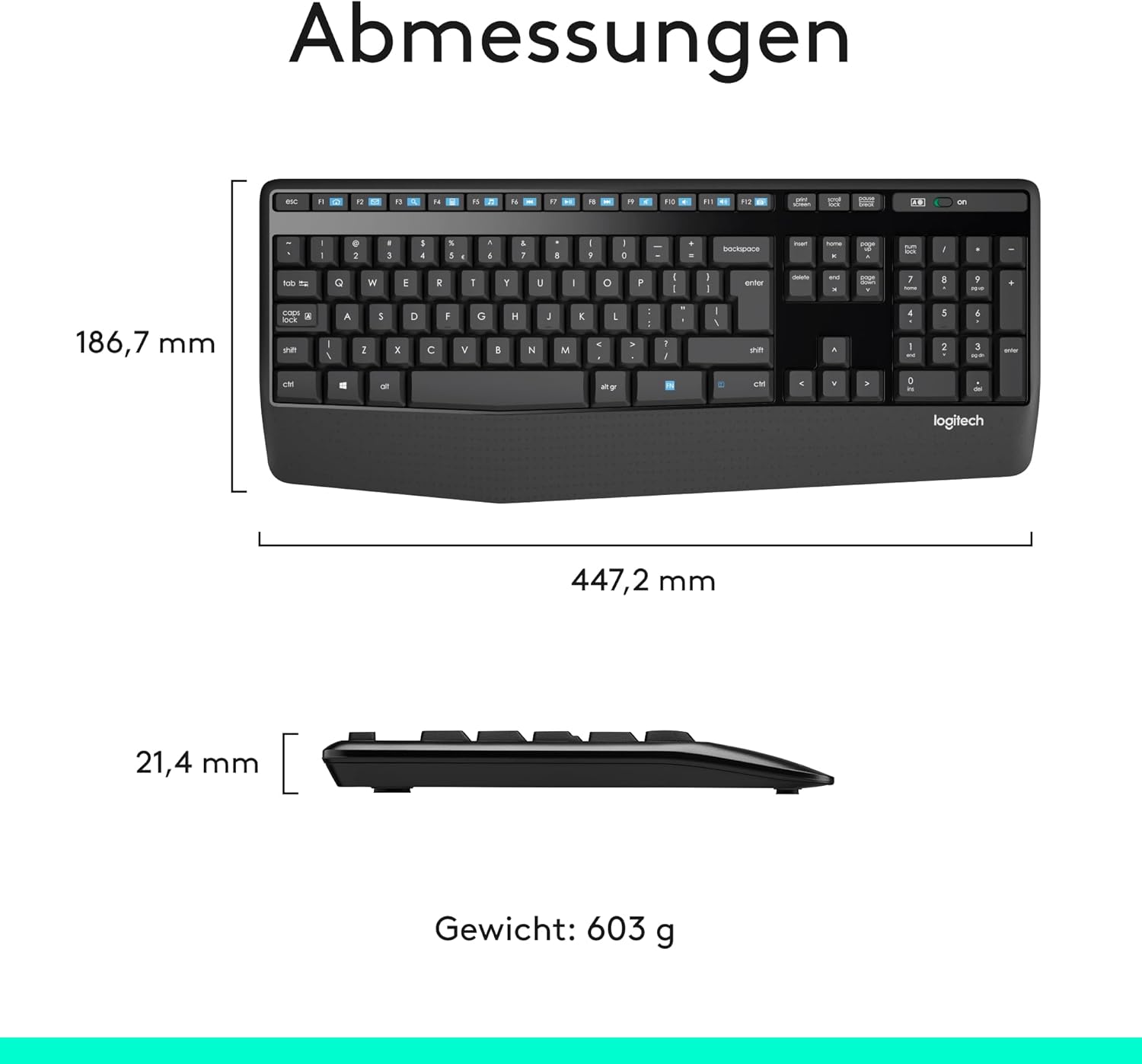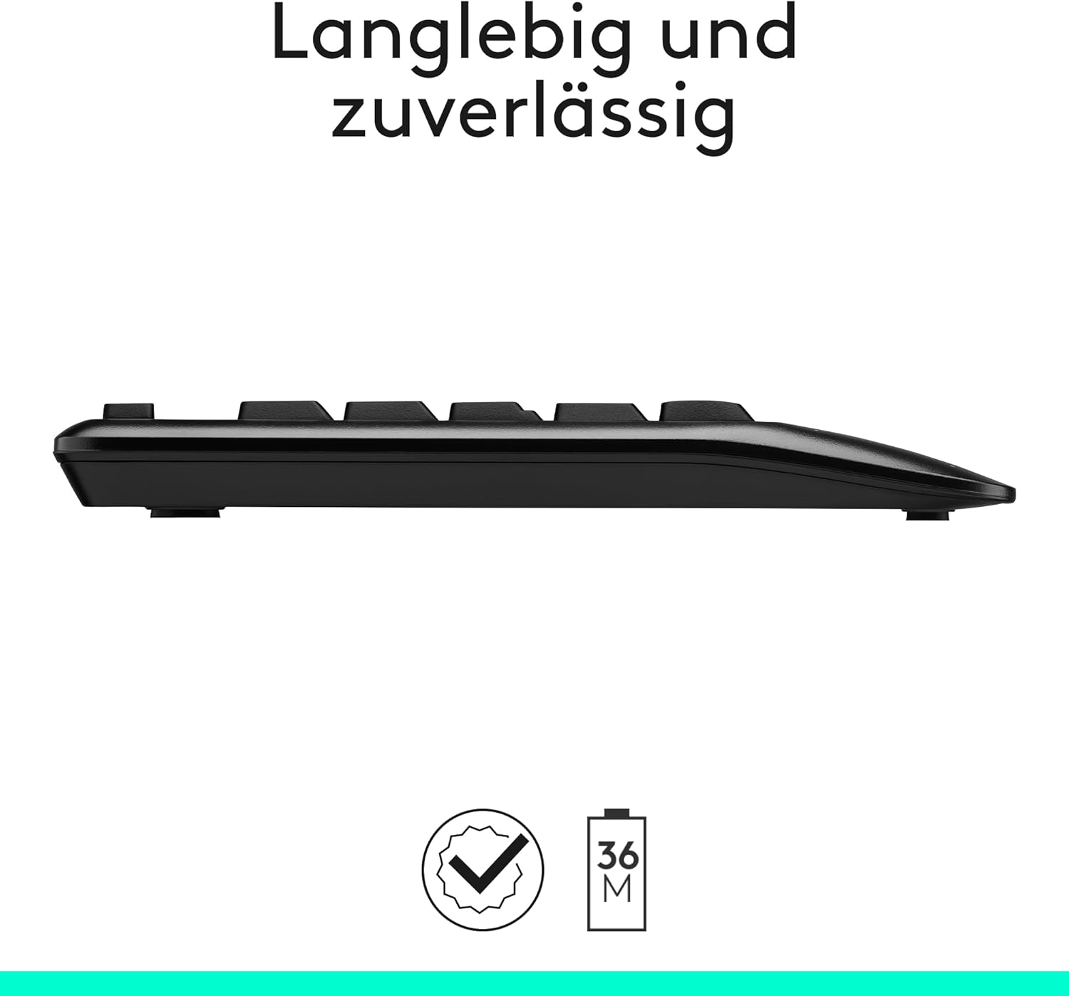 - Tastaturlayout in Standardgrösse: Bequemes, leises Tippen mit Handballenauflage, spritzwassergeschütztem Design (2) und leicht zugänglichen Tasten wie Stummschaltung, Lautstärke und Wiedergabe