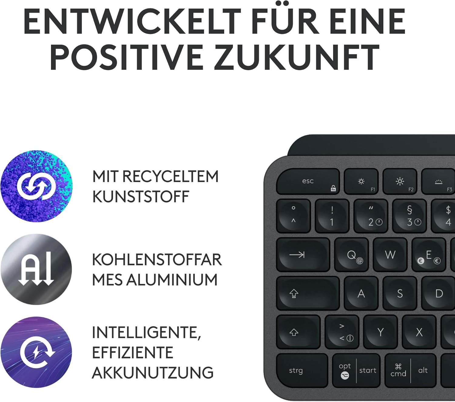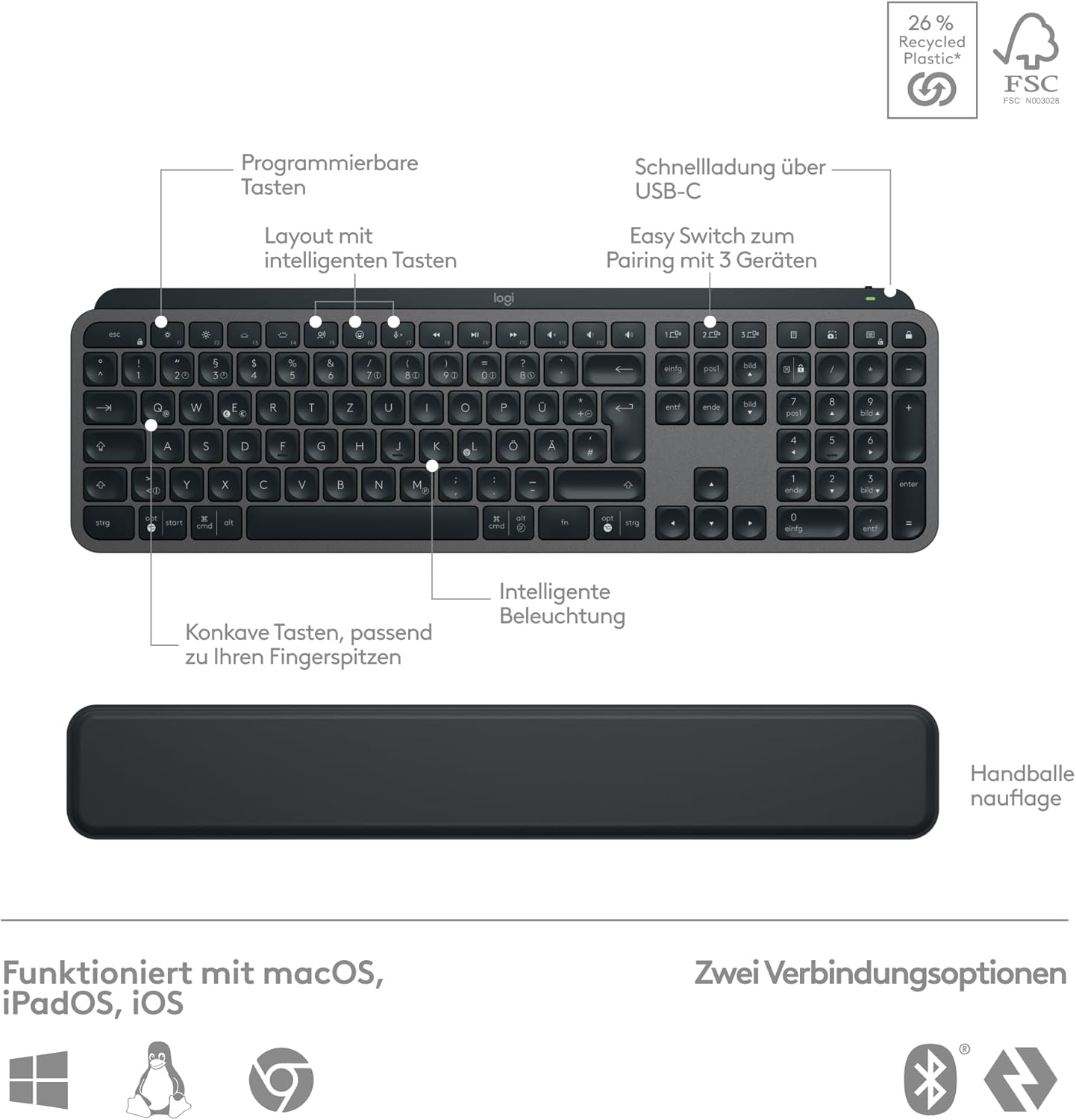 - MX Keys S und MX Master 3S enthalten zertifizierten, recycelten Postconsumer-Kunststoff - MX Master 3S (27% für Graphite, 22% für Pale Grey); MX Keys S (26% für Graphite und 11% für Pale Grey) (8)