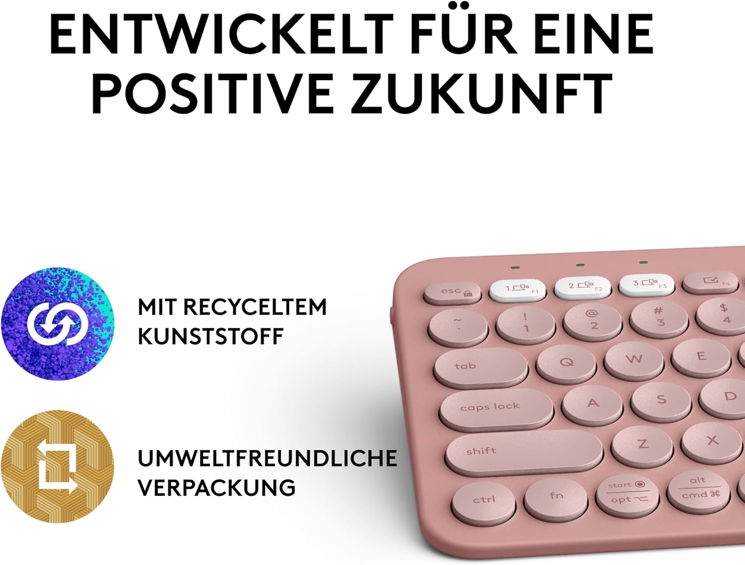 - Elegantes Design für ein gutes Gewissen: Die Kunststoffteile der schlanken Pebble Keys 2 K380s Tastatur bestehen zu mindestens 49 % aus zertifiziertem recyceltem Kunststoff(1)