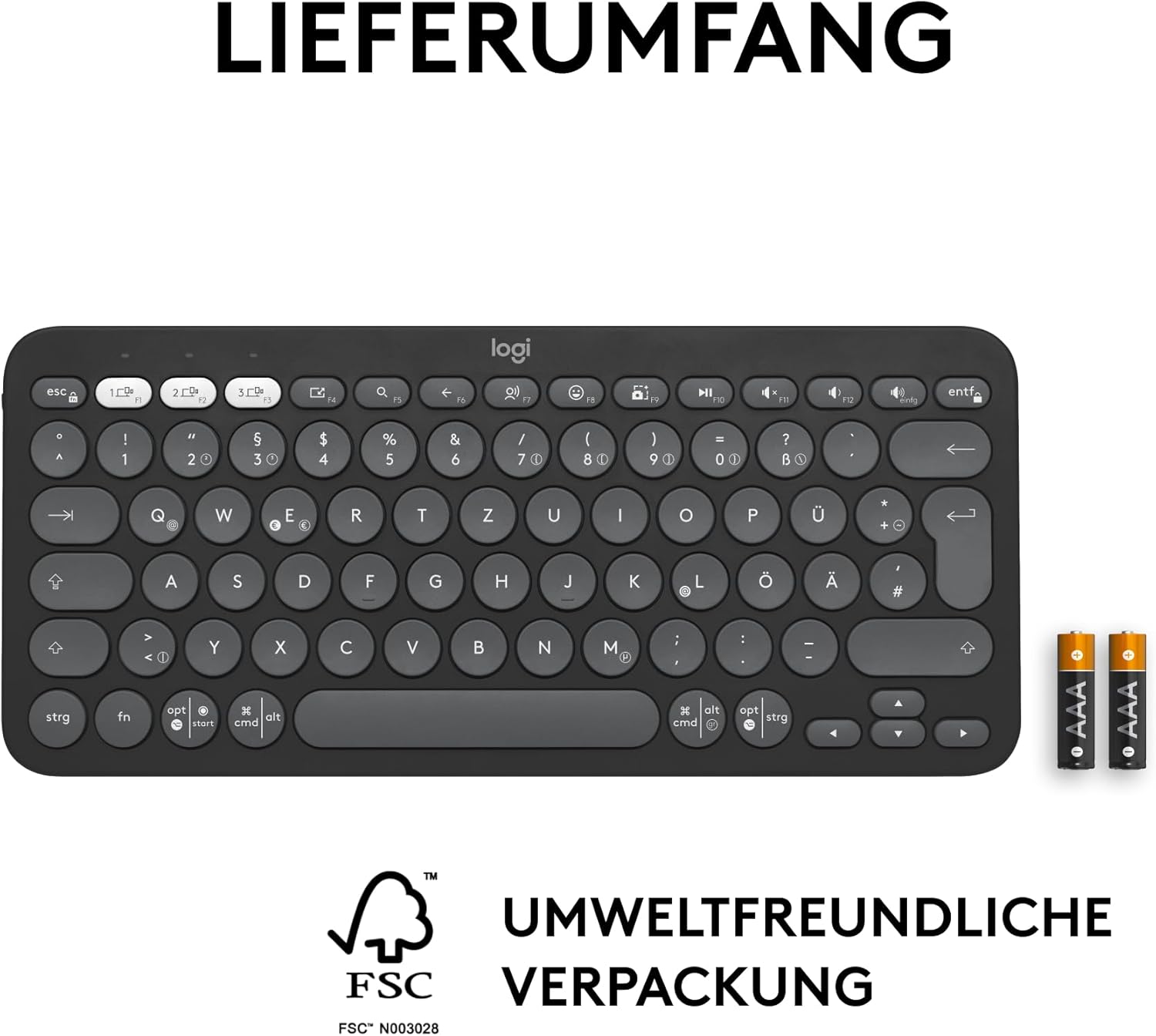 - Elegantes Design für ein gutes Gewissen: Die Kunststoffteile der schlanken Pebble Keys 2 K380s Tastatur bestehen zu mindestens 49 % aus zertifiziertem recyceltem Kunststoff(1)