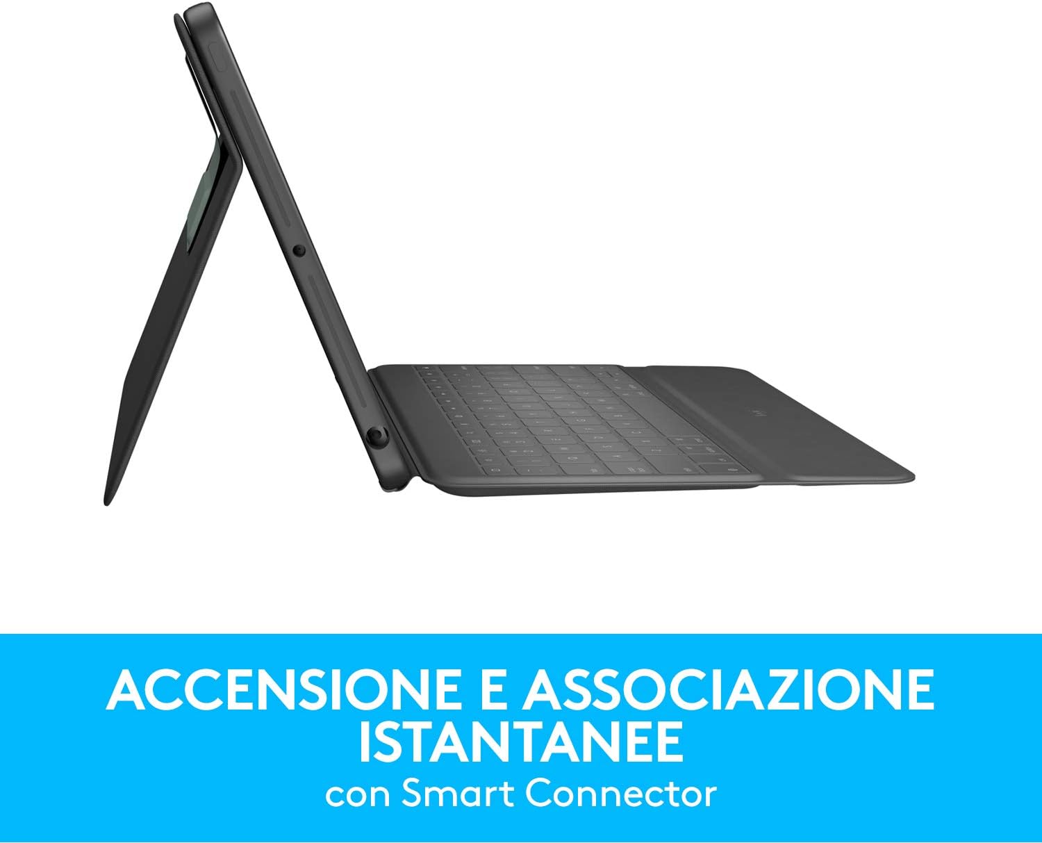 - Die Tastatur rastet über eine Magnetverbindung ein und stellt sofort eine Verbindung her. Es ist kein kompliziertes Bluetooth-Pairing nötig und die Tastatur bezieht ihren Strom direkt vom iPad (7., 8. und 9. Generation), sodass Sie sie nie aufladen