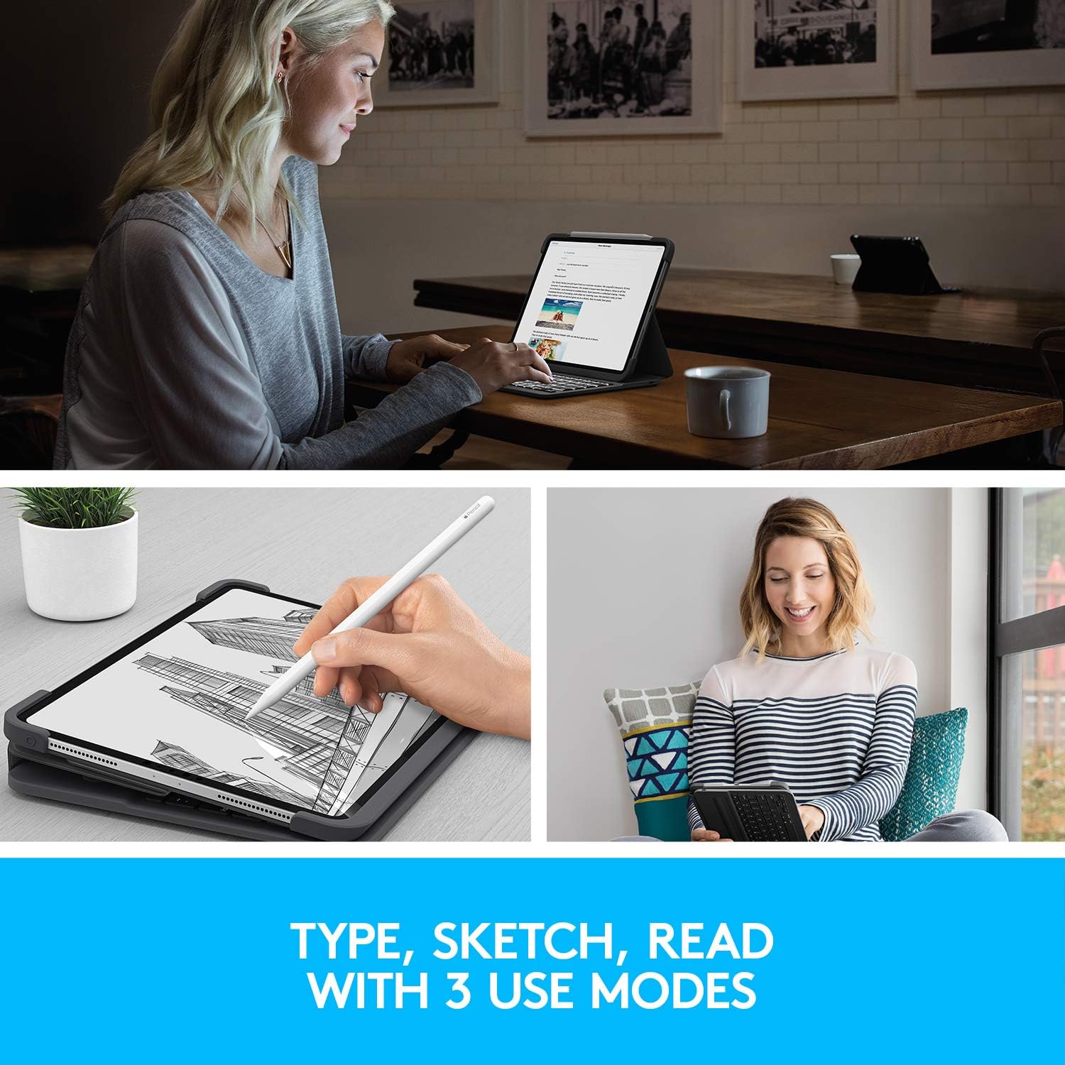 - AUFLADEN UND VERSTAUEN DES APPLE PENCIL – Sie können den Apple Pencil aufladen, ohne ihn aus dem Case zu nehmen. Nach dem Schreiben können Sie den Apple Pencil im Tastatur-Case verstauen und es mit dem Magnetverschluss sicher verschliessen