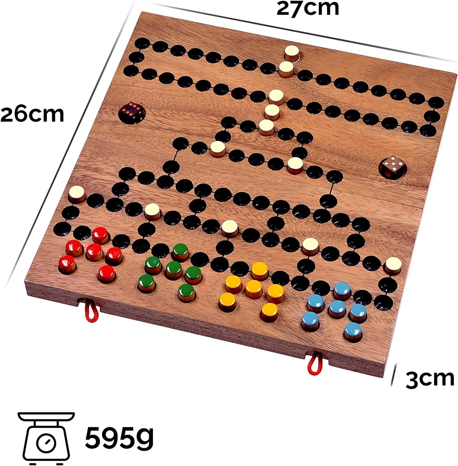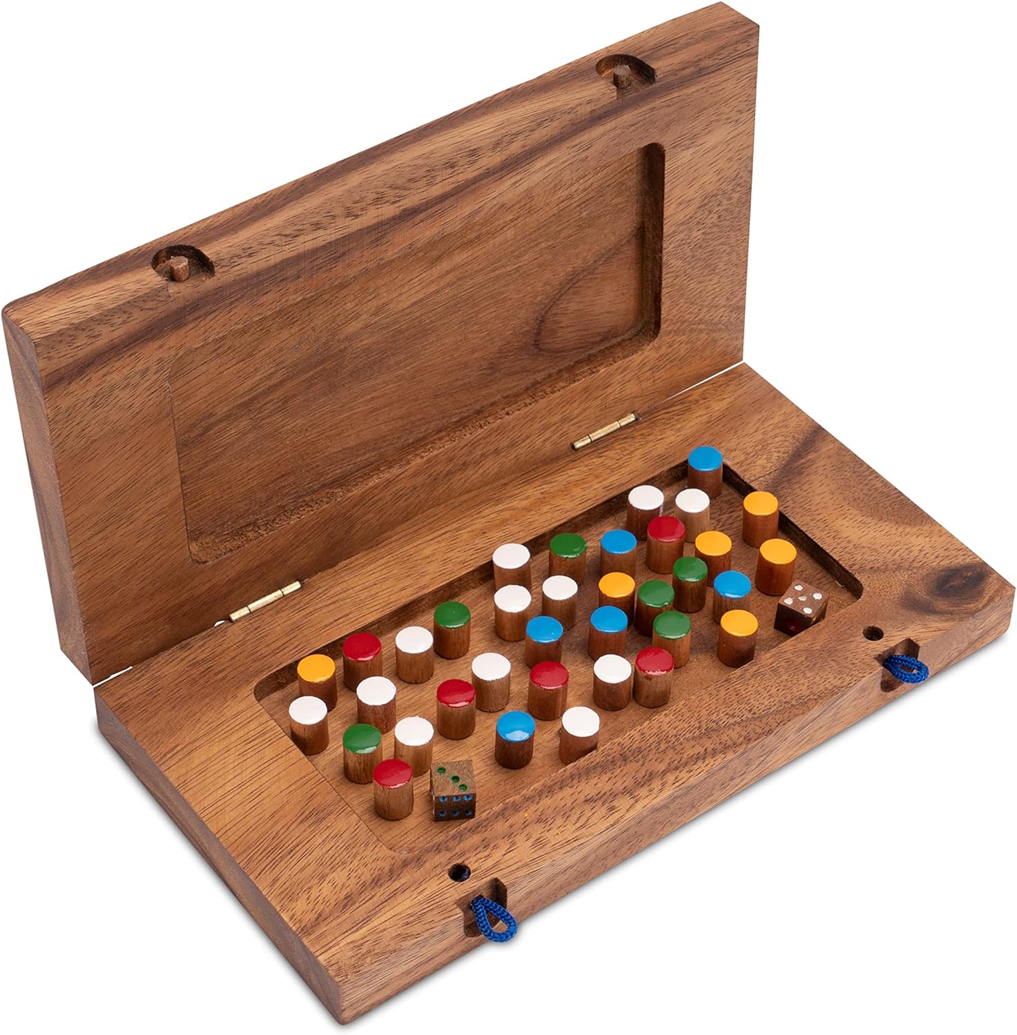 - Grosses, klappbares Spielbrett aus dunklem Samena-Holz mit farbigen Spielsteckern
