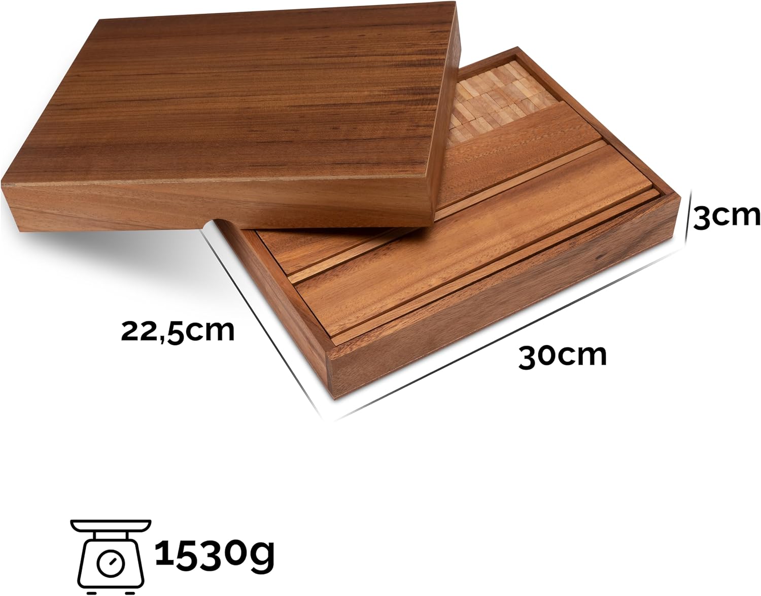 - Masse: Holzkasten 300 x 225 x 45 mm, Halterungen 268 x 53 x 30 mm, Spielsteine 30 x 20 x 5 mm