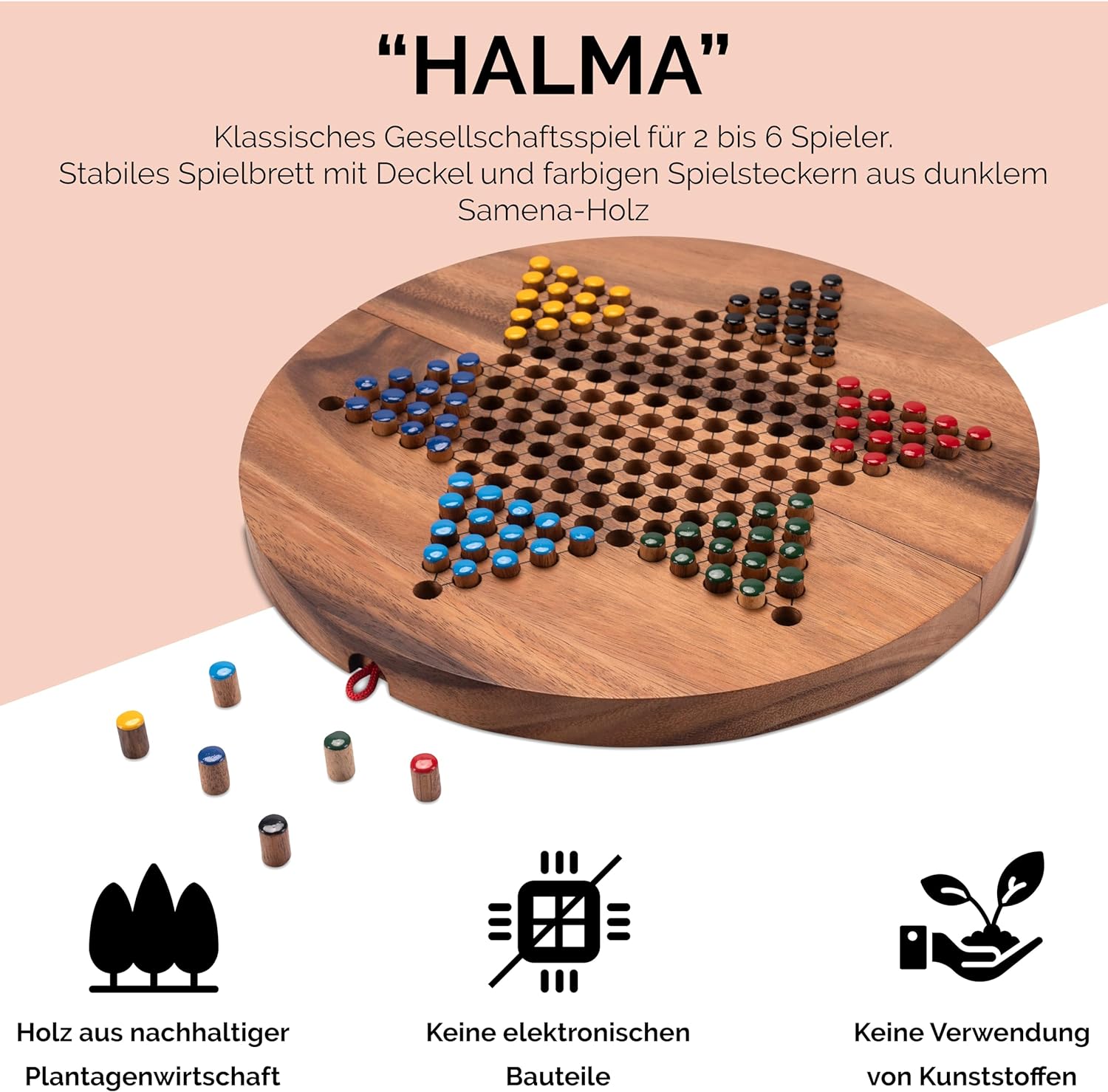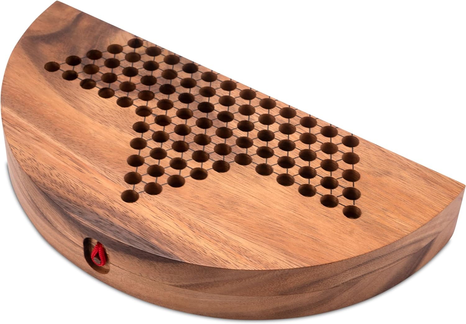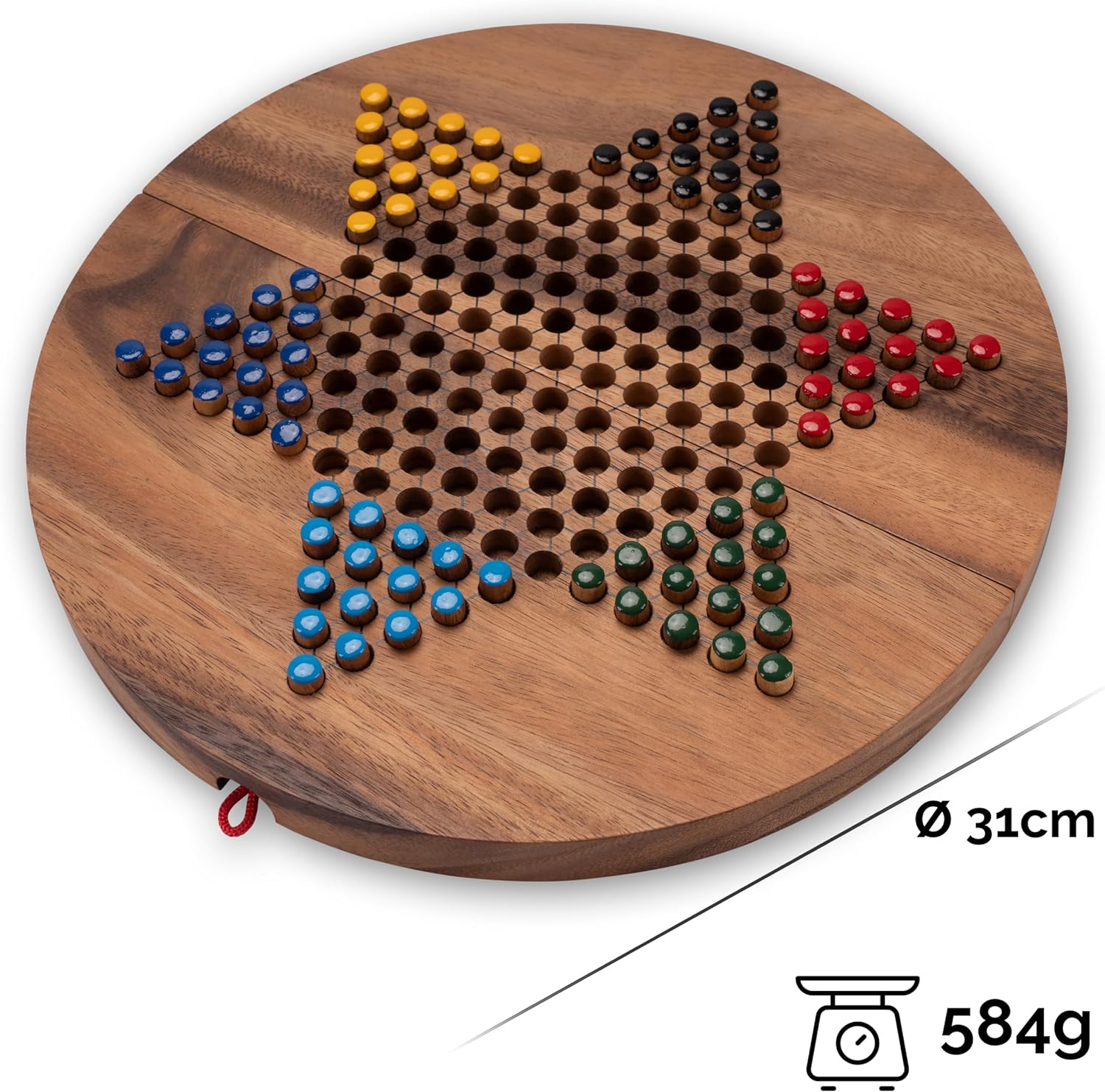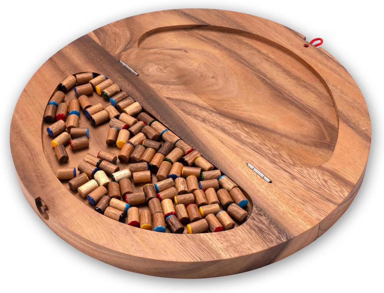 - Grosses, rundes, klappbares Spielbrett aus dunklem Samena-Holz mit je 15 farbigen Spielsteckern