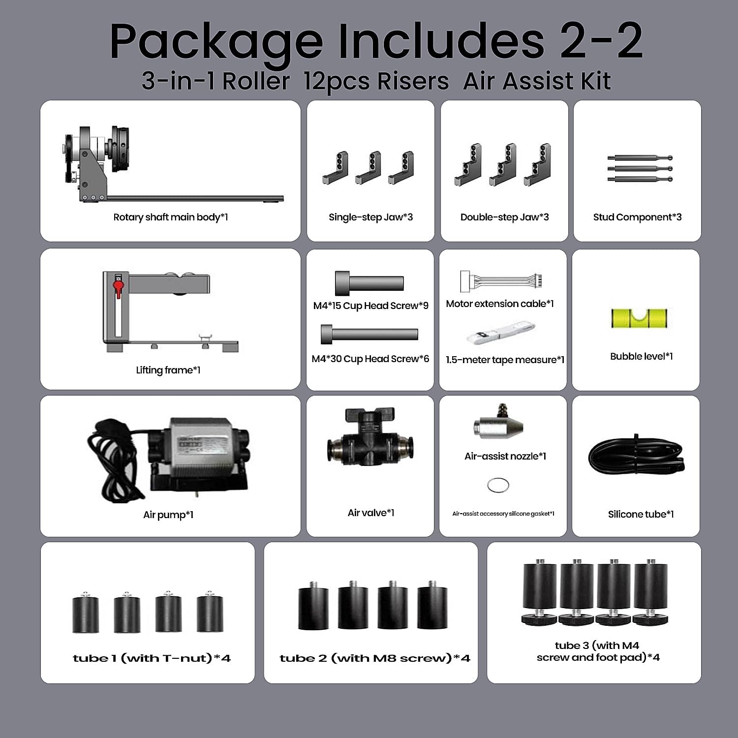 - Erweitertes Set, perfekte Ergänzung – Dieses Set enthält eine Luftpumpe, einen Rotationsaufsatz und 12 Erhöhungen. Die Luftpumpe sorgt für sauberere und gleichmässigere Schnitte – ideal zum Gravieren oder Schneiden von Materialien mit einer