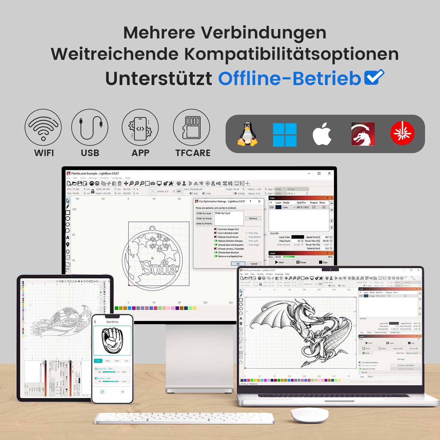 - Flexible Anschlussmöglichkeiten – Der Longer 10W Lasergravier- und Schneidegerät unterstützt USB-, TF-Karten-, Wi-Fi- und App-Verbindungen. Es bietet zudem Online- und Offline-Modi für noch mehr Komfort. Kompatibel mit professioneller