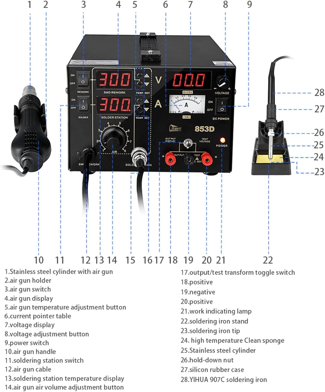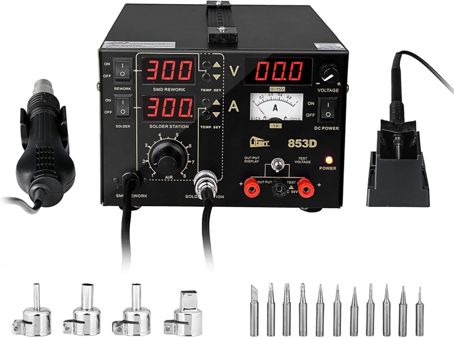 - 【LÖTSTATION 3 IN 1 FUNKTIONEN】853D 1A Digital Lötstation intergiert mit bleifreien Löt-Rework-Station 45W, Heissluftpistole 700W und DC-Stromversorgung 1A, ist ideal zum Löten und Entlöten bei der Reparatur an Mobiltelefonen und Elektrogeräten,