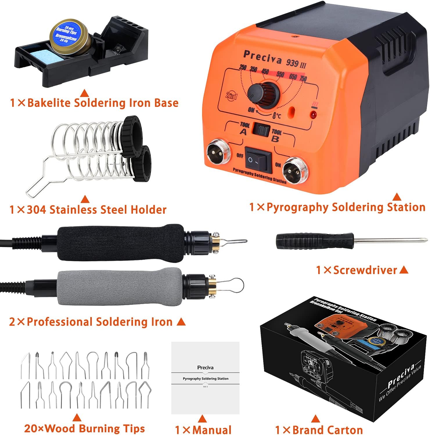 - 【40W Lötstation mit Transformator, schnelles Aufheizen】 Preciva bietet eine Lötstation mit 40W Transformator. Die Brandmalstation kann innerhalb von 10 Sekunden Betriebstemperatur erreichen und sofort in Betrieb genommen werden. Und sorgen für konstante Wärme, um die Verbrennungsarbeit gleichmässig zu erledigen. Die Abkühlgeschwindigkeit des Lötkolbens ist auch schnell nach dem Ausschalten, was den Austausch der Lötspitze vereinfacht.