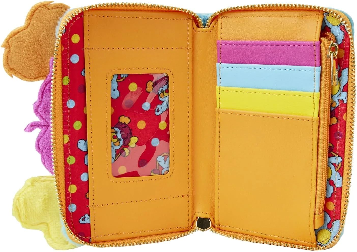 - This faux leather Loungefly wallet features an adorable Popples character with vibrant blue, yellow, orange and purple colors.