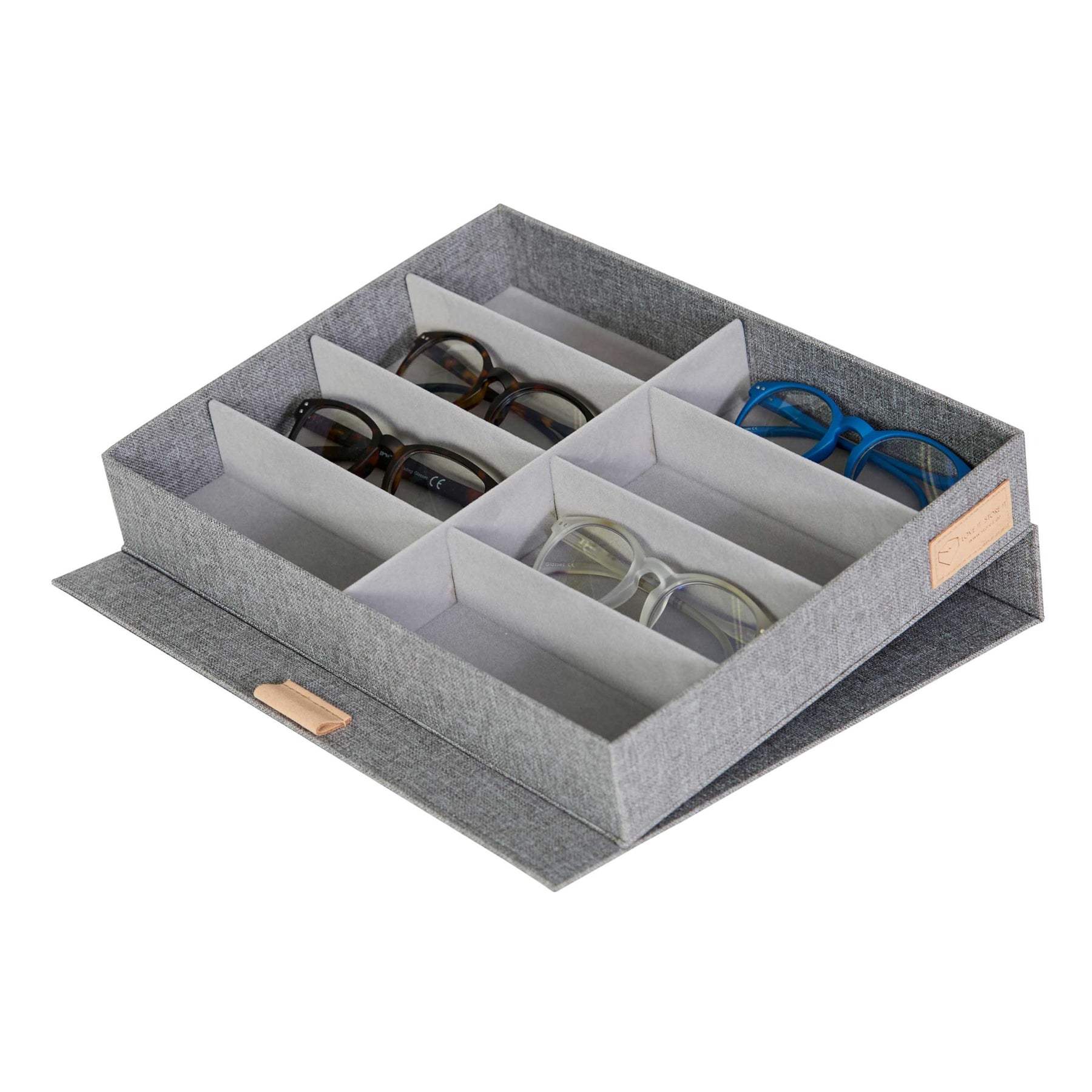 - Lieferumfang: 1 Aufbewahrungsbox mit Deckel für Brillenaufbewahrung mehrere Brillen - Mit 8 Fächern und Magnetverschluss - Aus Leinen, ausgekleidet mit Samt - Hellgrau - Masse: 32x25x5,5 cm (LxBxH)